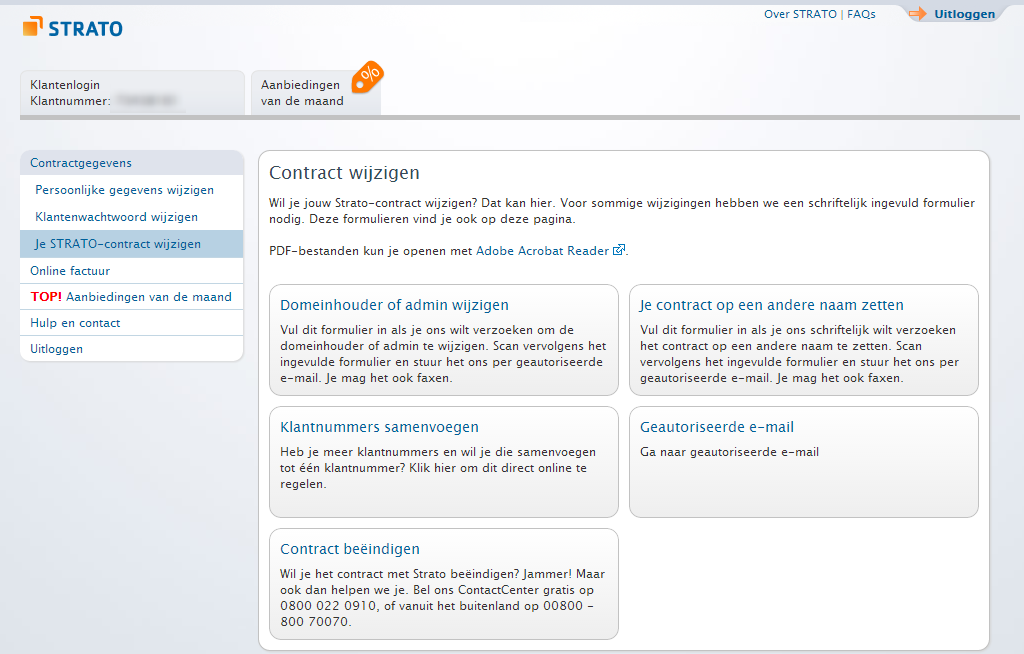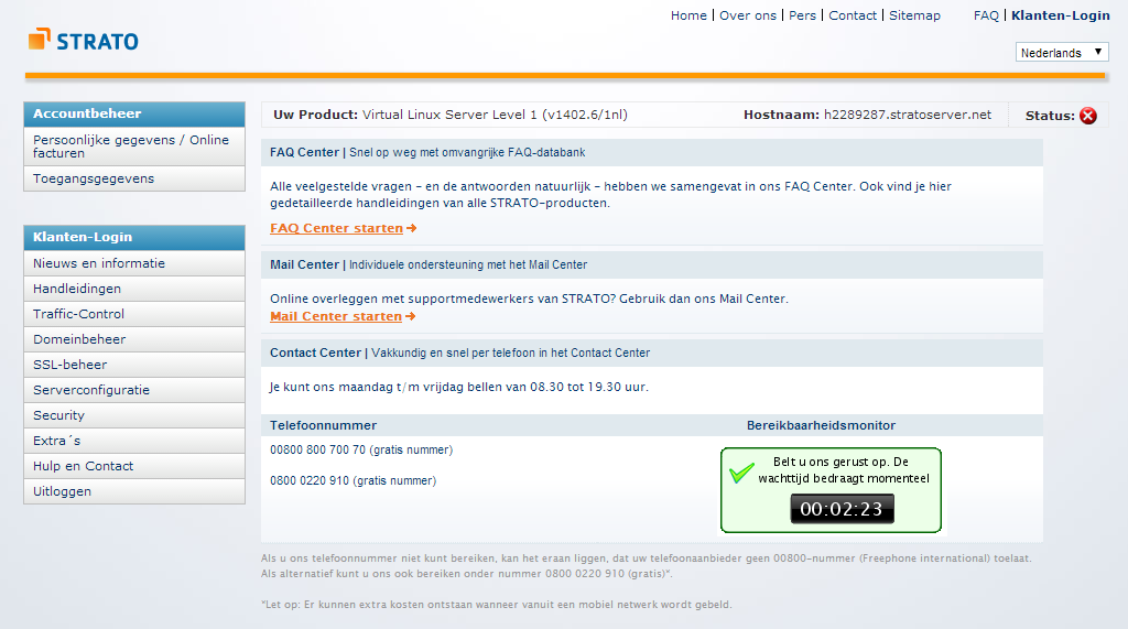 Het opzeggen van een server is echter niet zo makkelijk. Wanneer je via het menu bij contract wijzigen bent uitgekomen, staat er bij opzeggen: “Contract beëindigen Wil je het contract met Strato beëindigen? Jammer! Maar ook dan helpen we je. Bel ons ContactCenter gratis op 0800 022 0910, of vanuit het buitenland op 00800 – 800 70070.”. In de algemene voorwaarden van Strato staat expliciet opgemerkt dat opzeggingen alleen schriftelijk (waaronder per fax) kunnen. In het geval van consumenten moet de overeenkomst echter opgezegd kunnen worden langs de weg waarop deze is aangegaan. De telefonisch opzegging ging makkelijk en volgens de medewerker die we spraken hadden we ook via het contactformulier kunnen opzeggen. Binnen enkele minuten kregen we per e-mail een bevestiging van de opzegging.