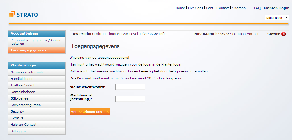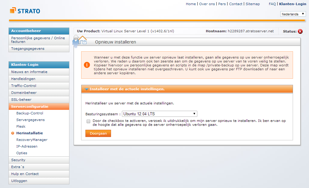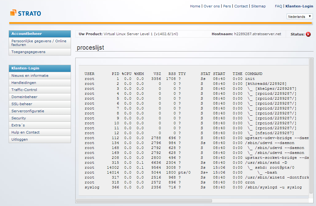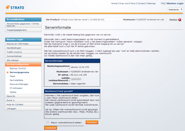 De server die we hebben besteld is te beheren via een pagina met “server gegevens”. Daar staat ook wel besturingssysteem is geinstalleerd, de hostname en ip-adres van de server, de status van de server en ook het rootwachtwoord dat door Strato (initieel) was ingesteld. Ook kunnen via deze pagina alle processen op de server actief zijn worden bekeken.