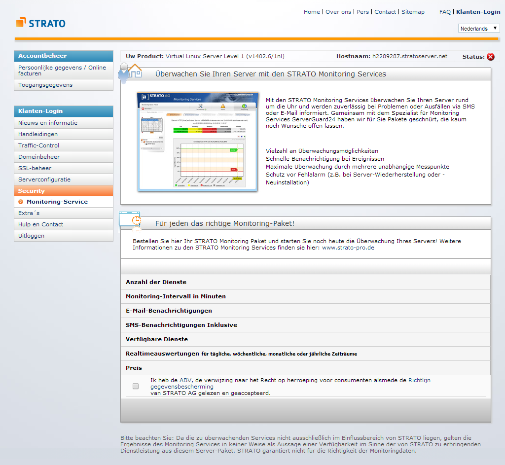 Het is ook mogelijk om monitoring in te stellen, maar dat moet afzonderlijk worden besteld. We komen daarvoor terecht op een Duitstalige pagina met een bestelformulier. Echter staat nergens de prijs van de dienst én ook een bestelknop ontbreekt.