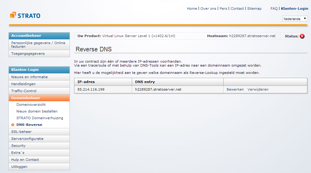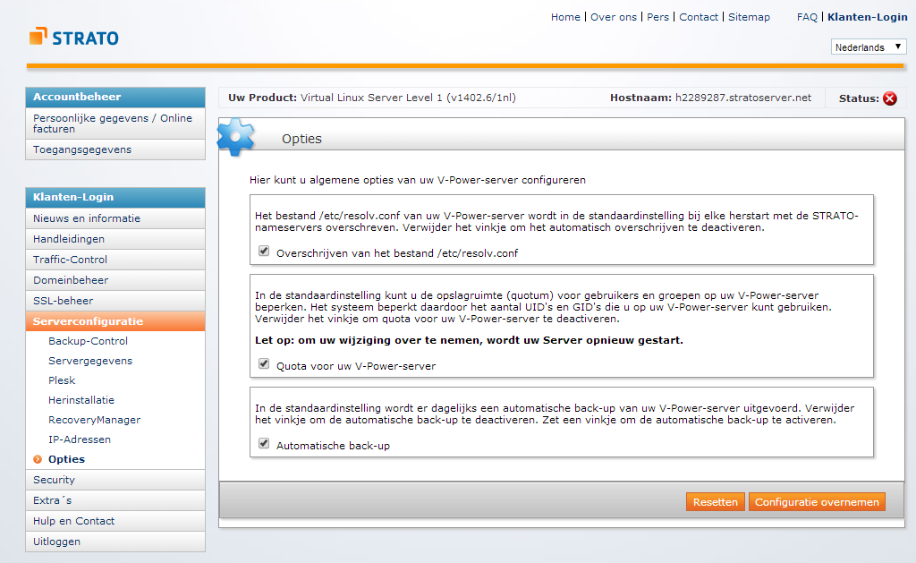 De reverse DNS van de server kan ook via het controle paneel worden ingesteld. Dit zit enigszins onlogisch verstopt onder het menu-item “domeinnamen”. Verder kan worden ingesteld over er automatisch elke nacht een backup van de server moet worden gemaakt, of dat er door Strato bepaalde quota moeten worden ingesteld op de server én of dat Strato het /etc/resolv.conf moet beheren. Deze wordt bij elke reboot van de server dan automatisch overschreven.