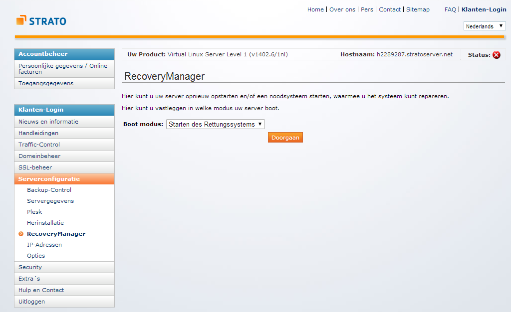 Er is geen eenvoudig systeem te vinden om de server te starten, te stoppen of te rebooten. Via het “RecoverySysteem” kan wel worden ingesteld of dat de server normaal of in een speciale recovery modus moet worden gestart. Na de optie van normale boot te hebben gekozen en op bevestigen klikten verscheen de melding: “De Normal-Boot-Modus is geactiveerd en uw server wordt binnen een paar minuten automatisch opgestart en von der Festplatte gestartet.”. Niet elegant, maar wel effectief, want de server werd gereboot.