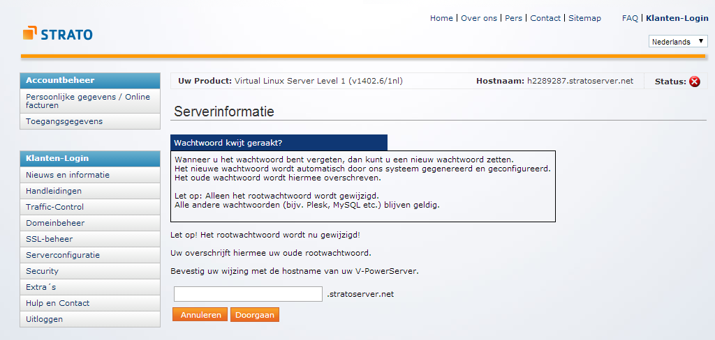 Indien het rootwacht door de gebruiker is gewijzigd en deze het nieuwe wachtwoord is vergeten, dan kan het rootwachtwoord via deze pagina worden hersteld. Deze functionaliteit hebben we getest en werkt uitstekend. Het nieuwe geresette rootwachtwoord is daarna ook zichtbaar op de pagina zodat de gebruiker niet bang hoeft te zijn het direct weer te vergeten. Een gebruiker hoeft bij Strato niet te vrezen zichzelf spreekwoordelijk buiten te sluiten bij zijn eigen VPS.