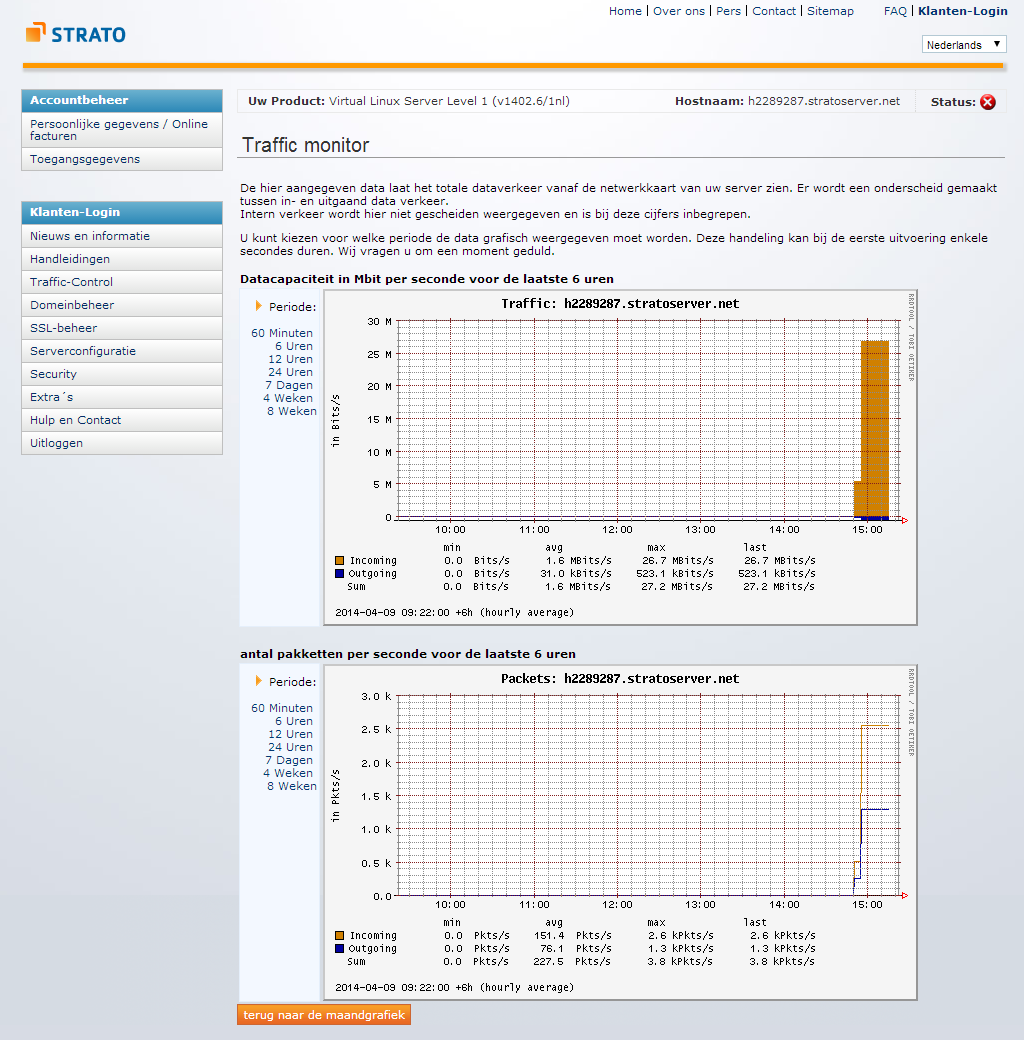 De hoeveelheid dataverkeer is bij Strato weleenswaar onbeperkt (voor de puristen: enkel technisch beperkt), maar toch is het fijn om te zien hoeveel bandbreedte er wordt verstookt. Er is een overzicht van de per dag gebruikte. Daarnaast is er een traffic monitor, waarin de bandbreedte statistieken te zien zijn. Wie behoefte heeft aan meer gegeven kan doorklikken naar een grafiek waarbij kan worden ingezoomd op een periode van de afgelopen 60 minuten tot de afgelopen 8 weken. Daarbij kan zijn worden gekeken naar het aantal Mbps als het aantal Pps. Ook biedt Strato ook een e-mailalert die wordt verstuurd wanneer een door de gebruiker ingestelde dagelijkse hoeveelheid dataverkeer is verbruikt.