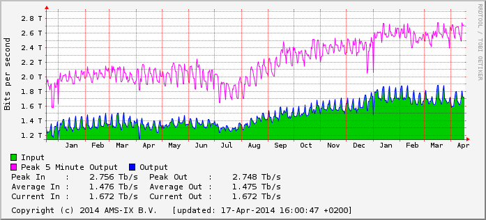 Ook voor dit jaar verwacht AMS-IX minstens zoveel nieuwe netwerken aan te sluiten als in 2013. Het piekverkeer op het AMS-IX platform zal naar verwachting dit jaar met 25% tot 32% groeien, zo laat een woordvoerster aan ISPam.nl weten.