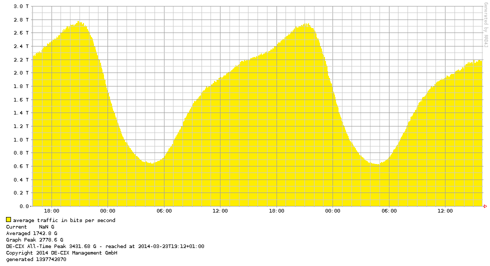 In Duitsland groeide de DE-CIX met 92 aangesloten partijen tot ′meer dan 500′ uit 52 landen. De IX groeide in het afgelopen jaar van 2,2 Tb/sec naar 3 Tb/sec op 8 januari 2014. Daarmee staan de Duitsers wereldwijd bovenaan.