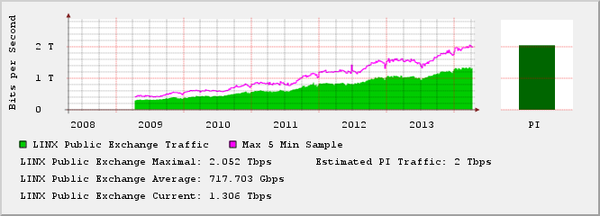 De andere grote internetexchange, die in Londen, sloot het jaar 2013 af met 492 aangesloten partijen uit 60 landen. De hoeveelheid piek-internetverkeer stond toen op 1.890 Tb/sec. Inmiddels is LINX de grens van 2 Tb/sec gepasseerd.