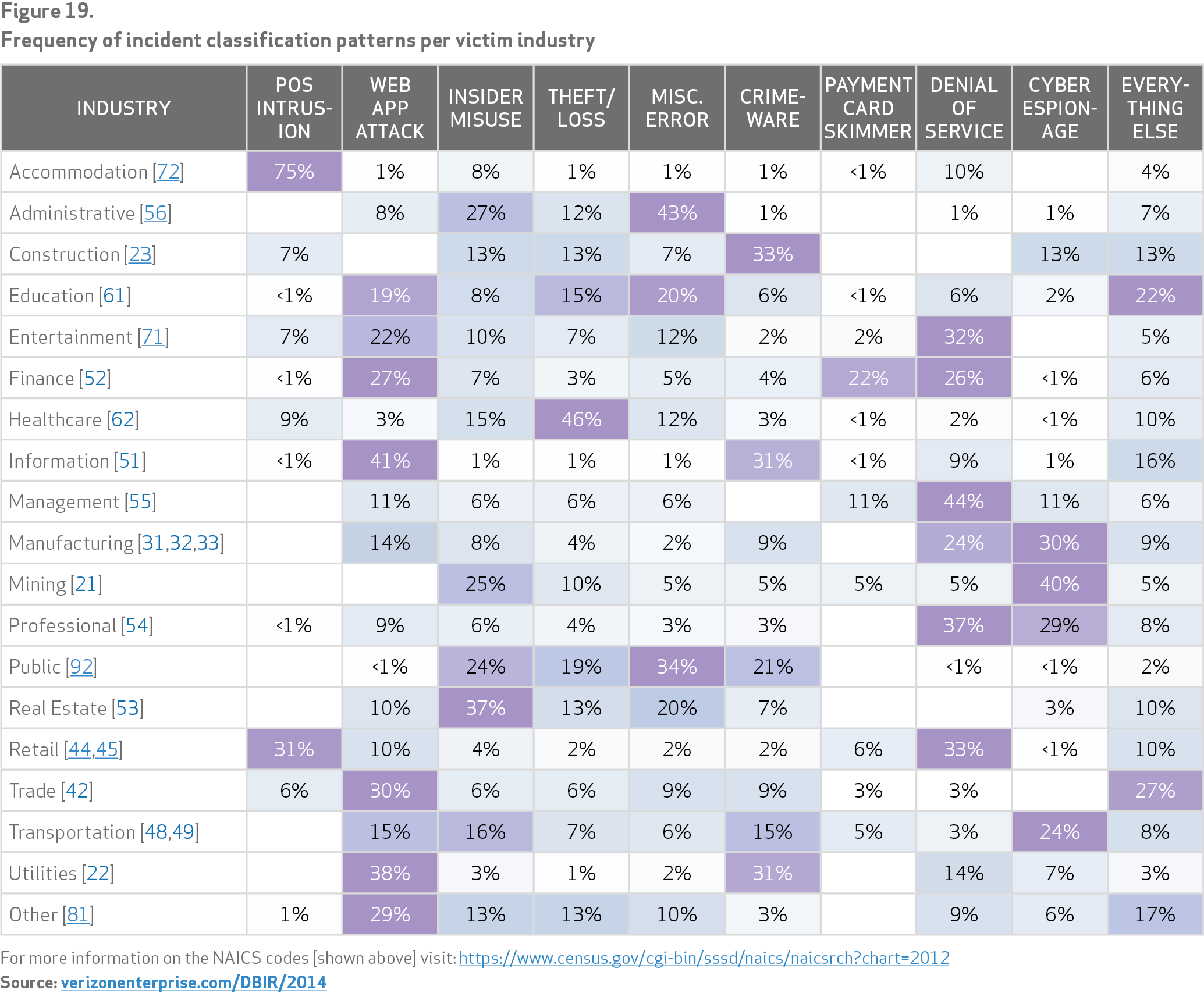 Het mooiste voorbeeld hiervan is deze figuur. Het illustreert welke risico’s sectoren lopen. Voor hosters en datacenters biedt dit overzicht ook een concrete commerciële kans. Je kunt namelijk op basis hiervan je klanten gerichter adviseren. Neem de sector ‘mining‘, die heeft 40% kans slachtoffer te worden van cyberespionage en maar 5% kans last te hebben van DDoS-aanvallen. Als je klant actief is in mining, kun je daar dus beter een gesprek mee voeren over maatregelen om spionage tegen te gaan dan een verkooppitch te starten over anti-DDoS-mogelijkheden.