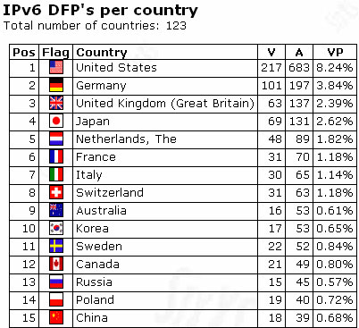 De Verenigde Staten nemen de eerste plek in, met 683 toegekende IPv6 blokken, waarvan er 217 daadwerkelijk actief zijn. Nederland komt er met een vijfde plek goed vanaf. Van de 89 toegekende IPv6 adresblokken, zijn er inmiddels 48 actief op het Internet. Als klein land, toch bijna 2% van het IPv6 Internet. Door enkele pro-actieve providers als BIT, de vierde IPv6-enabled nameserver van de SIDN en de NL-IX die binnenkort start met het weggeven van gratis IPv6 transit zal NEderland met de inzet van iedere provider deze positie goed vast moeten kunnen houden.