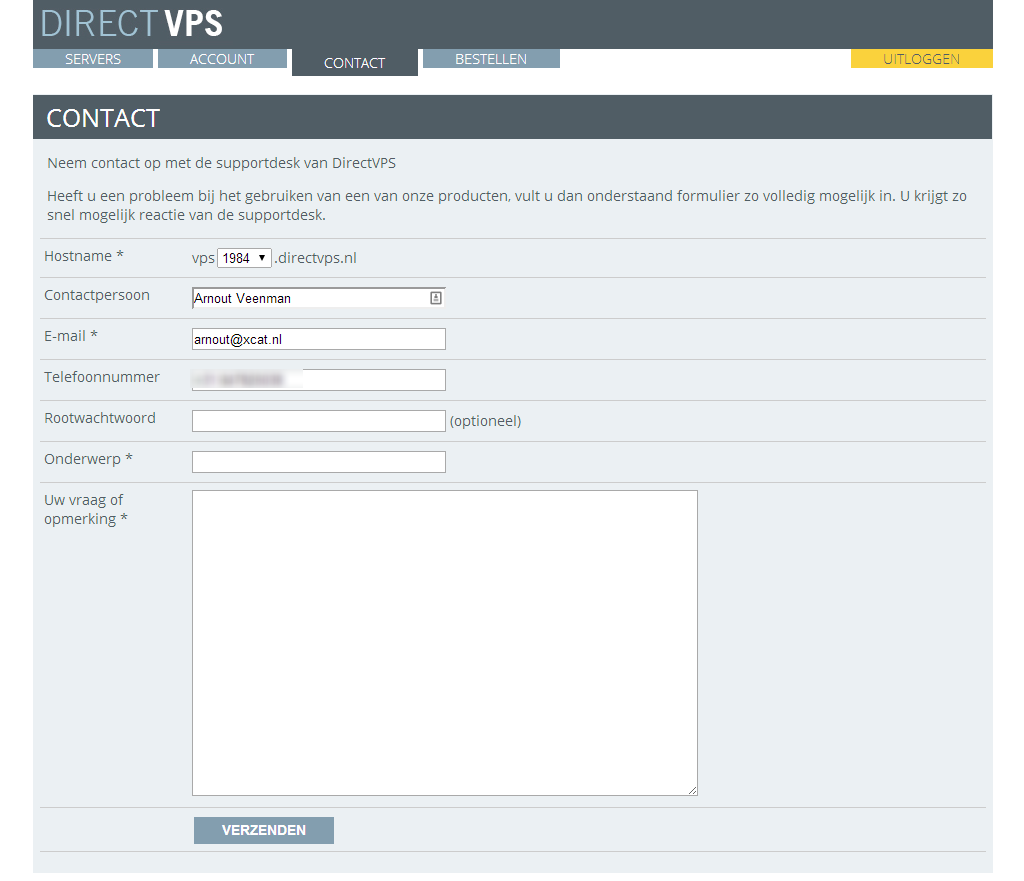 Het indienen van een support ticket kan ook via het controle paneel, daarbij moet direct worden aangegeven om welke server het gaat. Daarnaast kan ook het rootwachtwoord van de server (optioneel) worden opgegeven in een apart veld.