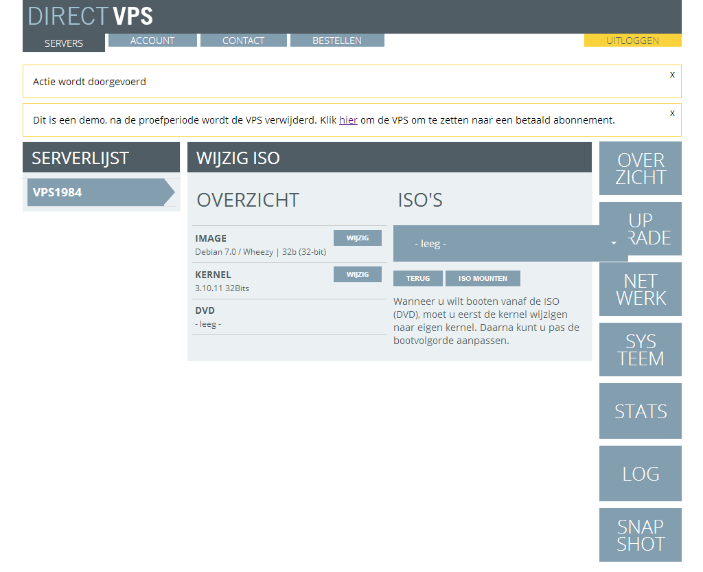 De systeem pagina biedt de mogelijkheid om niet alleen het besturingssysteem (image) van de server aan te passen, maar ook de gewenst kernel aan te passen. Daarnaast is het ook mogelijk om een (virtuele) DVD te mounten. Qua images is er een zeer uitgebreide lijst van besturingssystemen, waarbij er ook per besturingssysteem verschillende versies beschikbaar zijn. Hetzelfde geldt voor de de DVD’s die kunnen worden gemount. Bij het veranderen van de kernel kan er zelfs een eigen kernel worden geupload. Wanneer daar voor gekozen is kan ook de bootsequence van de server die standaard DVD, HDD, netwerk is worden aangepast via de pagina.