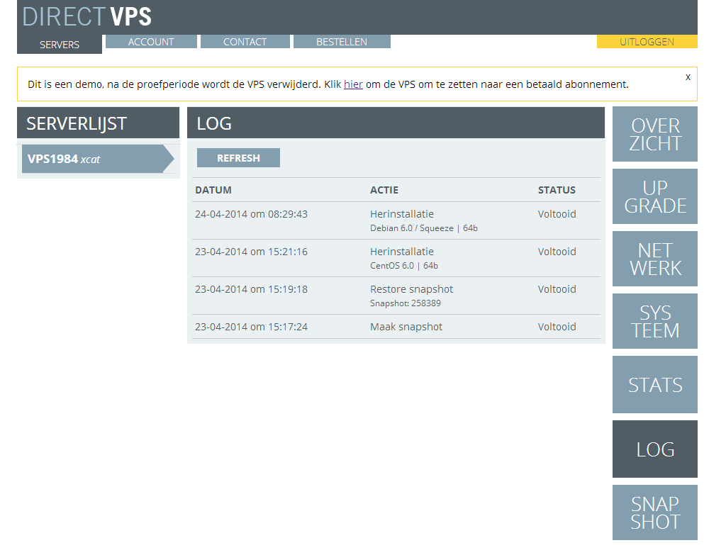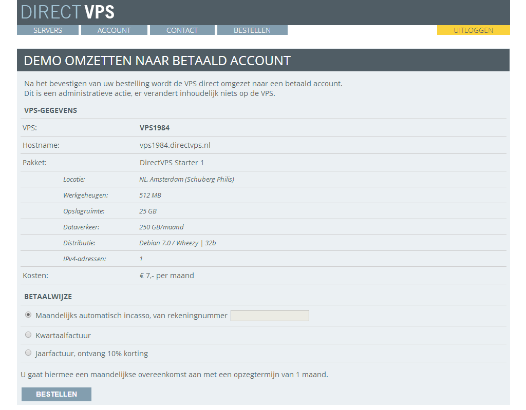 Over het opzeggen kan ik helaas weinig zeggen. DirectVPS biedt de mogelijkheid om de server 7 dagen vrijblijvend kosteloos uit te proberen. Van die mogelijkheid heb ik dan ook gebruik gemaakt. Na 7 dagen wordt de server automatisch gedeactiveerd en 11 dagen daarna verwijderd. Dat de server niet stilzwijgend wordt verlengd maar enkel op (expliciet) verzoek van de klant, vind ik een goede zaak.