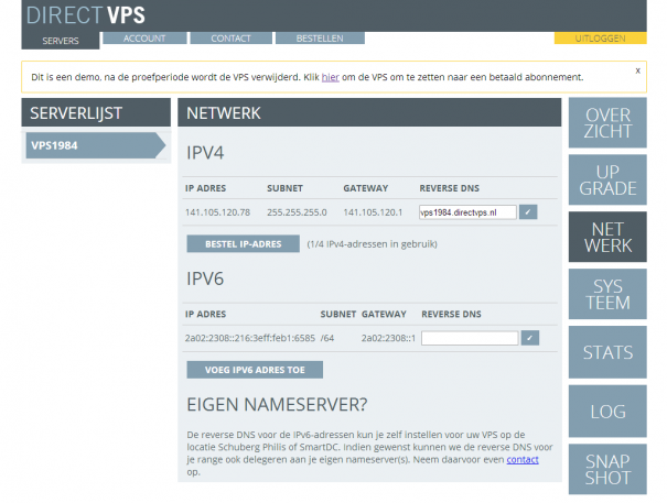 Op de netwerk pagina kunnen eenvoudig de IP-adressen van de server worden beheerd. IPv4-adressen kunnen via een pagina worden bijbesteld en IPv6-adressen worden aangemaakt. De gebruiker kan zelf (het laatste deel) van het gewenste IPv6-adres bepalen. Daarnaast is via de netwerk pagina ook de reverse DNS per IP-adres eenvoudig in te stellen. De reverse DNS is daarnaast ook te delegeren naar de eigen nameservers. Een mailtje naar DirectVPS volstaat om dat te regelen.