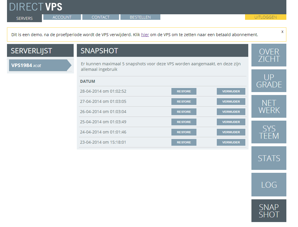 Het systeem biedt de mogelijkheid om 5 snapshots aan te maken. Dat kan handmatig met één klik. Daarnaast lijkt het systeem ook ’s nachts automatisch een snapshot aan te maken. In het overzicht van de snapshots zie ik namelijk ineens een snapshot staan die allemaal rond 1 uur ’s nachts zou zijn aangemaakt. In het controle paneel zie ik deze functionaliteit niet gedocumenteerd en ook lijkt het niet mogelijk deze uit te zetten. Al is het automatisch aanmaken van snapshots een mooie functionaliteit.