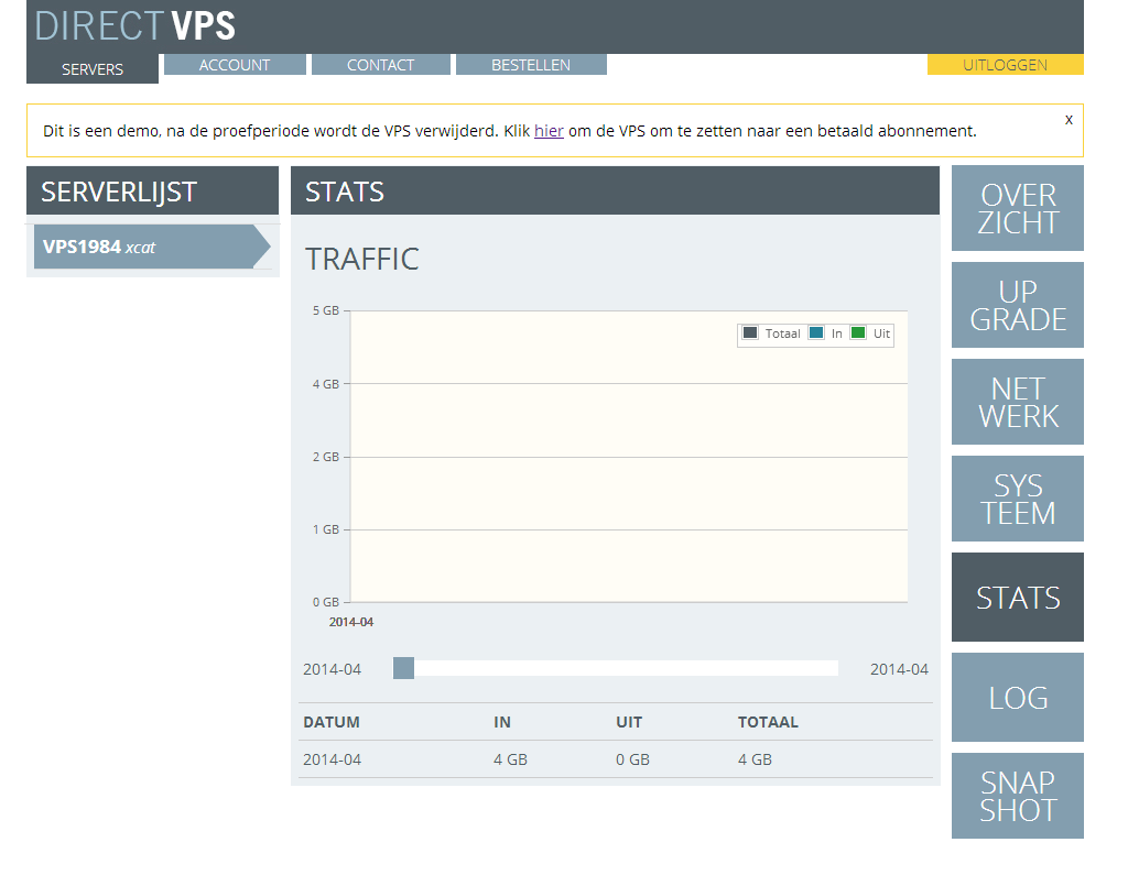 Er zijn enkel statistieken van de hoeveelheid dataverkeer. In een grafiek lijkt het er op dat deze per maand worden weergegeven. Echter blijft de grafiek volledig leeg in mijn geval. Daaronder staat een tabel met het verbruikte dataverkeer gesplitst in inbound, outbound en totaal per maand. Verdere statistieken over bijvoorbeeld cpu- en geheugen-gebruik lijken te ontbreken. Ook lijkt het niet mogelijk om verder in te zoomen op het dataverkeer. Er lijkt geen mogelijkheid aanwezig om de server te monitoren en een melding te krijgen in het geval van van een storing. Dat is jammer.