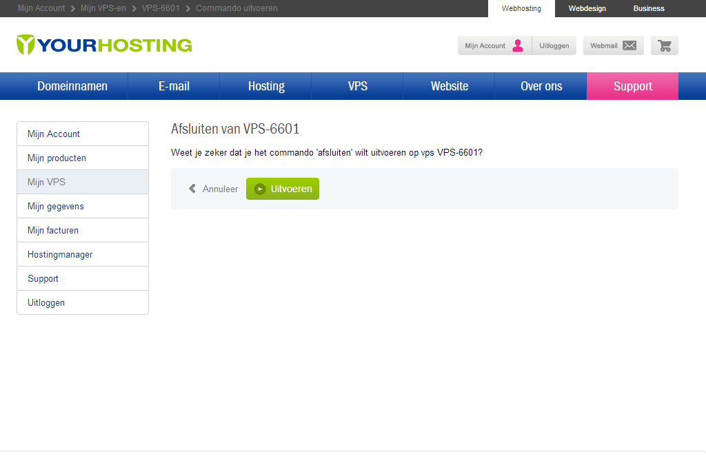 Wanneer wordt geklikt op de link afsluiten, dan kom ik terecht op een aparte pagina waar mij wordt gevraagd of ik zeker weet dat ik die actie wil uitvoeren. Zodra ik daar op heb geklikt ga ik weer terug naar de overzichtspagina waar bovenaan de melding verschijnt dat de actie wordt uitgevoerd en die melding verandert niet veel later in de melding “VPS – Wordt afgesloten…”. Wanneer het afsluiten nog te lang duurt kan de server ook alsnog geforceerd worden afgesloten, waarna de server meteen is gestopt.