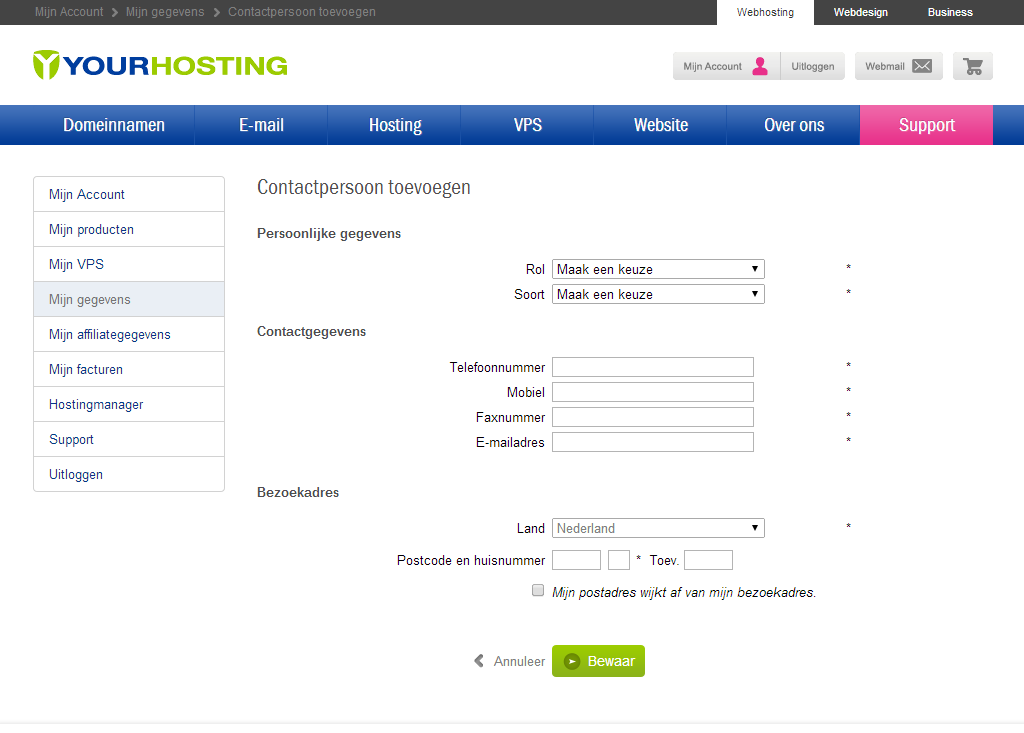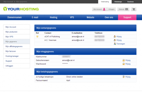 Het aanpassen van de contactgegevens levert ook geen verrassingen op. Wel interessant is de mogelijkheid om verschillende gebruikers toe te voegen, voor facturatie, technisch beheer, overig en tekenbevoegd. Dat werkt allemaal prima.
