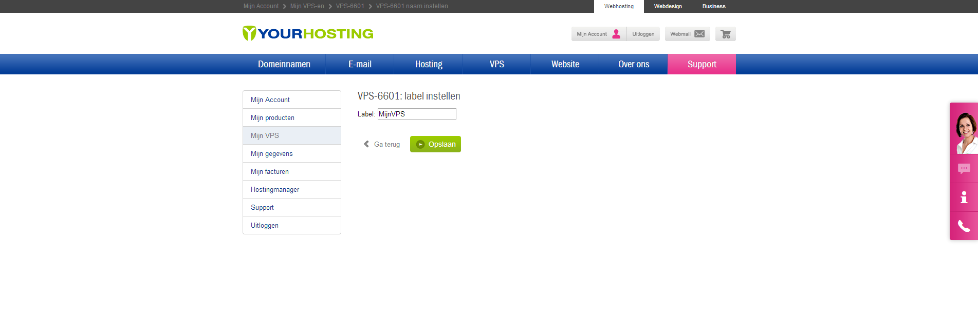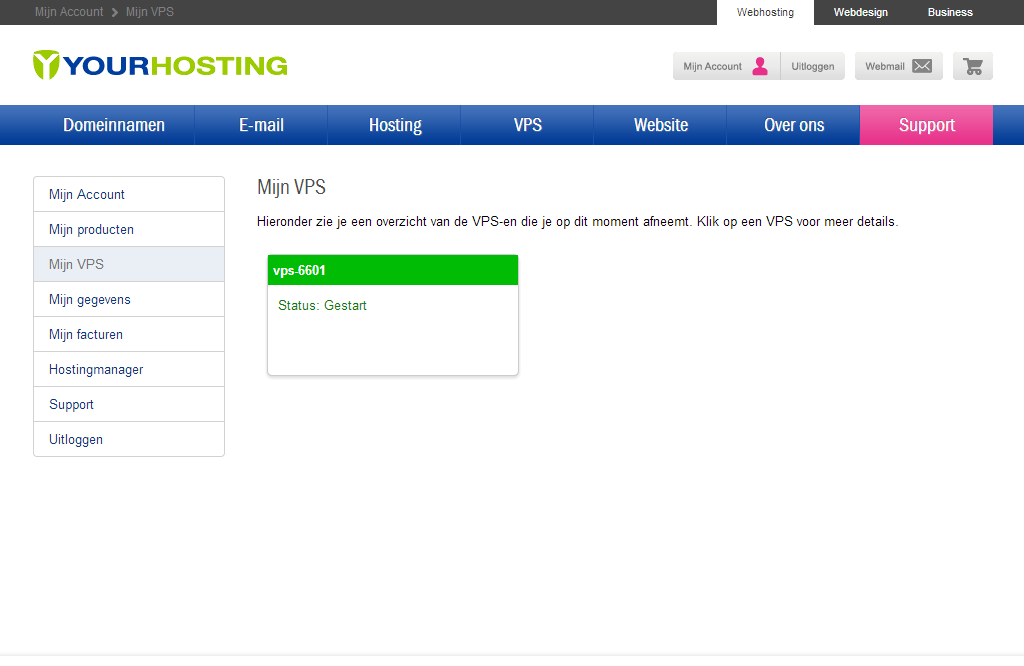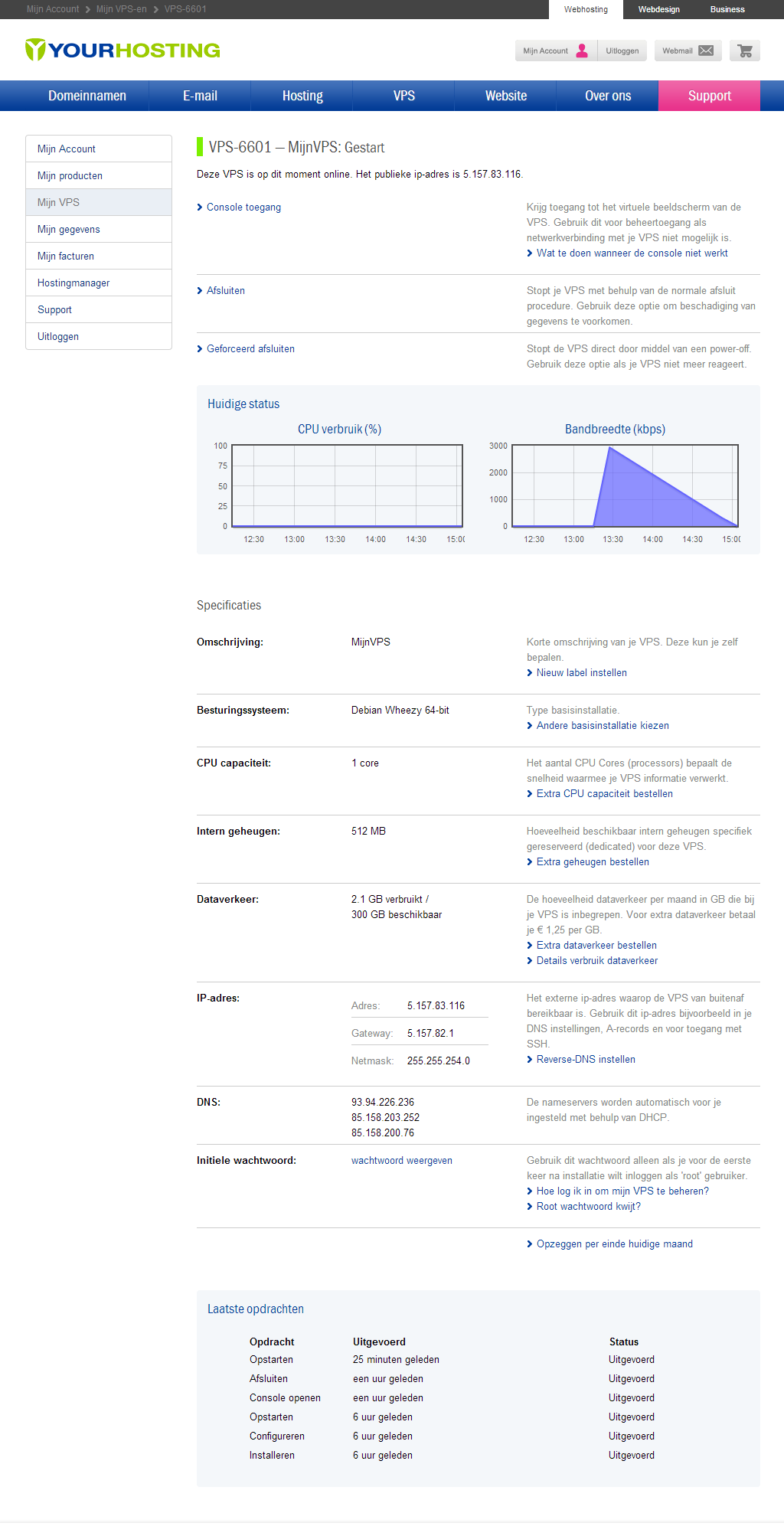 Het controle paneel waarmee de virtuele server bij Yourhosting kan worden beheerd is vrijwel volledig geconcentreerd op één enkele pagina. Bovenaan de pagina staat de naam en status van de server. Daaronder staat alle belangrijke informatie en acties die met de server kunnen worden uitgevoerd.