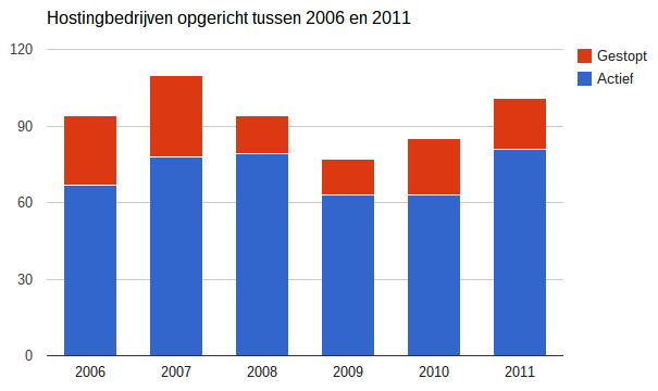 Het aatal hostingbedrijven dat in 2005 en 2006 is opgericht en op dit moment niet meer actief is, ligt in beide jaren op 29% en bij de bedrijven opgericht in 2008 en 2009 gaat het om 18% en 16%. Opvallend is dat er bij bedrijven opgericht in 2010 het zelfs gaat om 25% en 2011 om 20%.