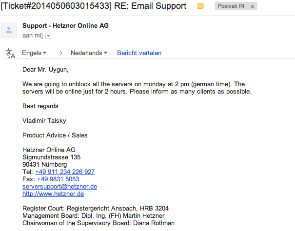 Uit een e-mailwisseling tussen Hetzner en de (vrijwillige) moderators van het forum van Hostdeal blijkt dat het Hetzner aankomende maandag om 14:00 uur, gedurende twee uur de toegang tot de servers van Hostdeal tijdelijk zal herstellen. Wat er daarna met de servers van Hostdeal zal gebeuren blijft echter onduidelijk. ISPam.nl heeft zelf vanmorgen ook vragen gesteld aan de persafdeling van Hetzner, maar daar is (nog) geen antwoord op gekomen.