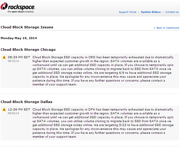 Het tijdelijke tekort aan de zogeheten Cloud Block Storage op SSD-schijven komt doordat het bedrijf te maken heeft gehad met een “dramatically higher than expected customer growth in the region”. In het Dallas datacenter waren de SSD-schijven op 2 mei al op, terwijl het Chicago datacenter op 12 mei al snel volgde.