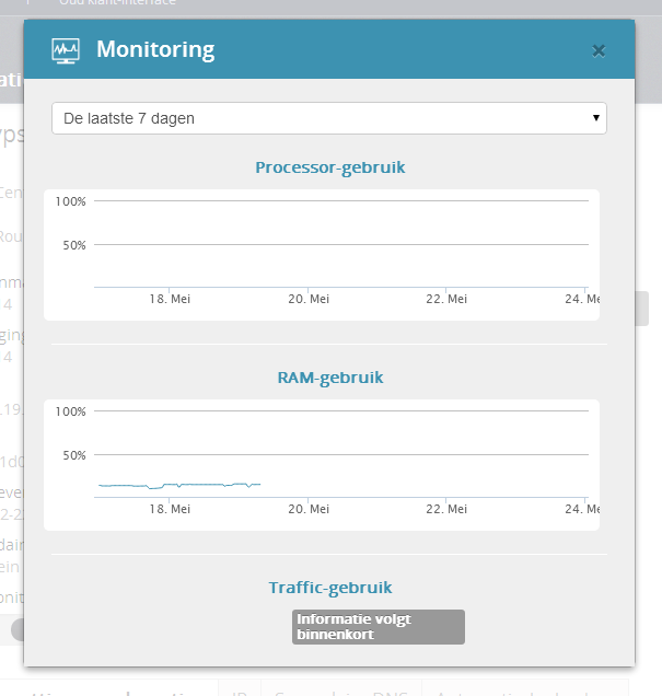 Historische grafieken over de gebruikte resources zijn te bekijken via de knop ‘Monitoring’. Daarbij kan worden ingezoomd op grafieken van vandaag, de laatste 24 uur, afgelopen 7 dagen, verleden maand en laatste 12 maanden. Opvallend is dat alleen het cpu- en geheugengebruik zichtbaar is en ook hier bij het verbruikte dataverkeer de melding ‘Informatie volgt binnenkort’ staat.