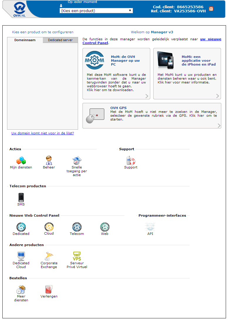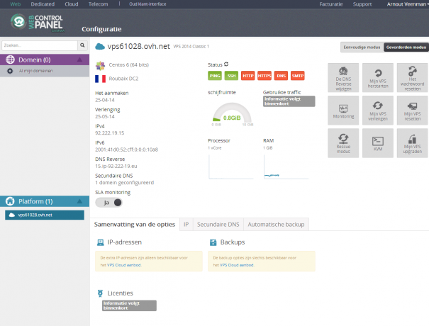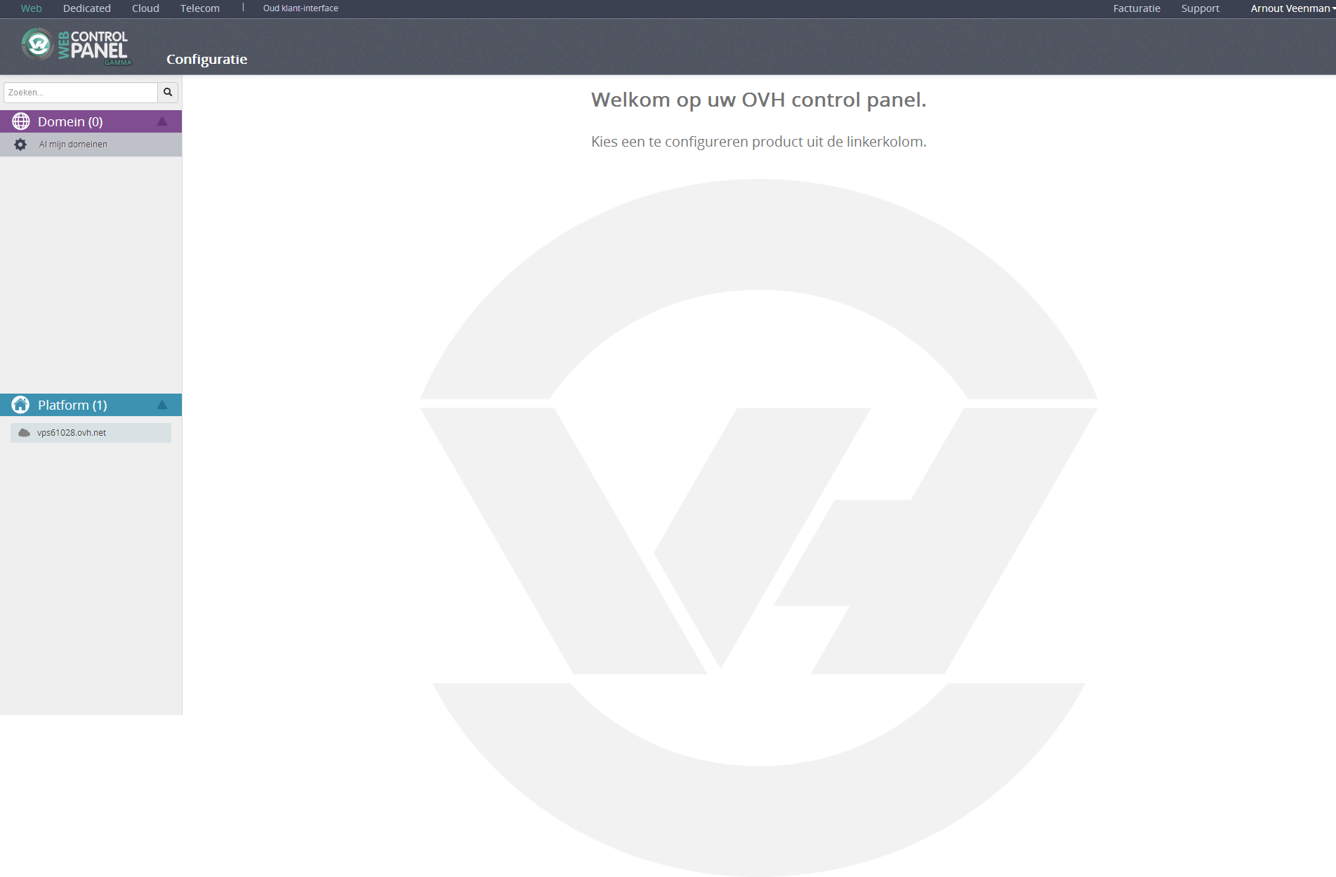 Wanneer ik inlog bij OVH kom ik uit op een soort overzichtspagina met de naam ‘OVH Manager’. Bovenaan de pagina staat een dropdown box met “(Kies product)”. Echter staat er geen enkel product in de lijst. Onderaan de pagina zie ik een icoontje met VPS met daaronder ‘Serveur Privé Virtuel’. Wanneer ik daar op klik, kom ik op een volgende overzichtspagina terecht, waar onder het kopje ‘Platform (1)’. Een hostname van een VPS aantref. Wanneer ik daarop klik, wordt er een pagina geladen waar de virtuele server daadwerkelijk beheerd kan worden.