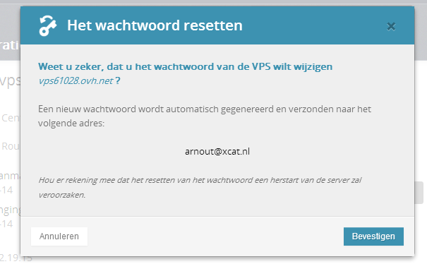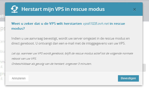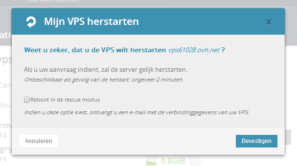 Er is geen mogelijkheid om de server uit te schakelen. Wel is het mogelijk om de server te herstarten. Daarbij bestaat ook de mogelijkheid om te herstarten in een speciale rescue modus. Wanneer ik dat doe krijg ik per e-mail logingegevens waarmee ik met SSH-verbinding kan maken met de server. Zodra de server opnieuw opgestart wordt, start deze weer met het reguliere besturingssysteem. Ook is het mogelijk om vanuit het controlepaneel het root-wachtwoord van de server te resetten. Het nieuwe wachtwoord wordt daarna per e-mail verstuurd en de server zelf wordt herstart. Verder kan er ook vanuit het controlepaneel via een noVNC terminal op de server worden ingelogd.