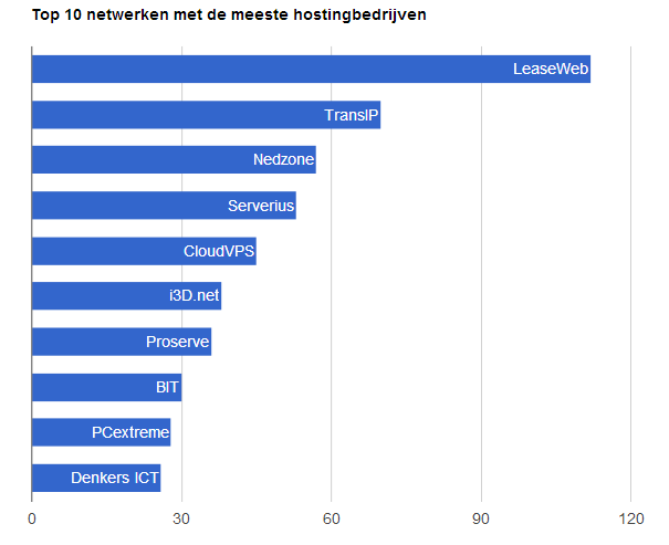 Wanneer we verder inzoomen op de top 10 dan valt op dat de nummer één LeaseWeb met 112 verschillende hostingbedrijven of 8,6% van het totaal met kop en schouders boven de rest uitsteekt. Het bedrijf wordt gevolgd door TransIP met 70 hostingbedrijven, Nedzone met 57 hostingbedrijven, Serverius met 53 hostingbedrijven en CloudVPS met 45 hostingbedrijven.