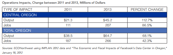 De bouw van het datacenter zelf leverde heel Oregon maar liefst 573,2 miljoen dollar aan investeringen en omzet op en 3.592 manjaren aan werk. Deze kunnen worden uitgesplitst in 292,2 miljoen dollar investeringen en 1.456 banen voor het bouwen zelf, 129,6 miljoen dollar aan omzet en 838 banen bij leveranciers en 150,7 miljoen dollar aan omzet en 1.298 banen bij de rest van de middenstand in Oregon.