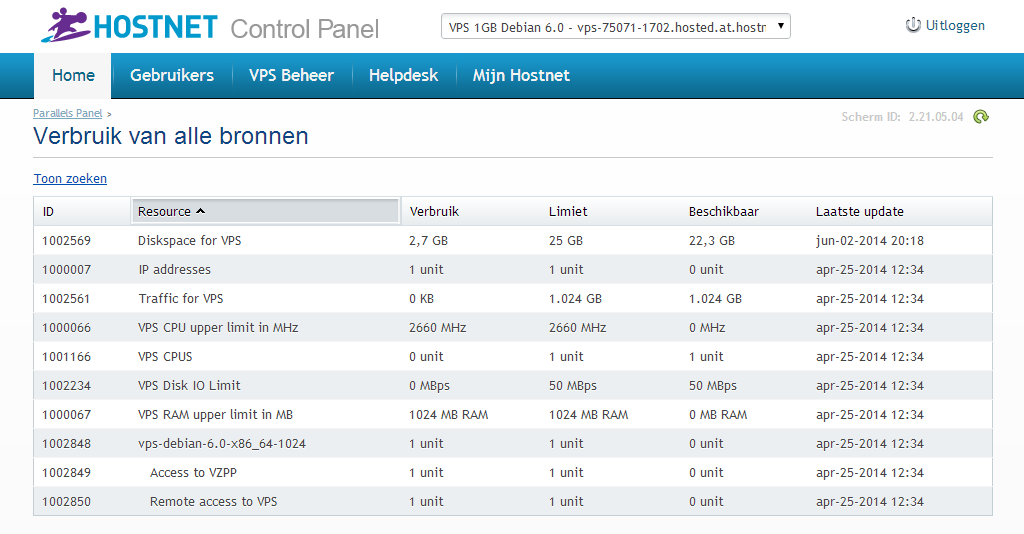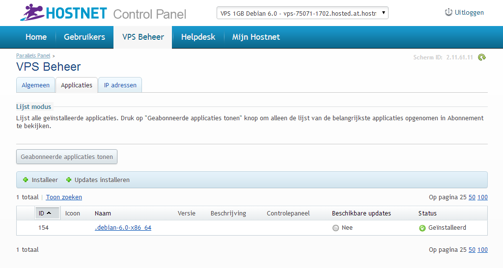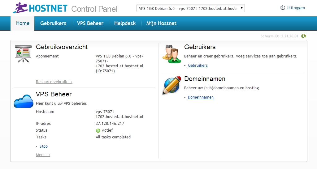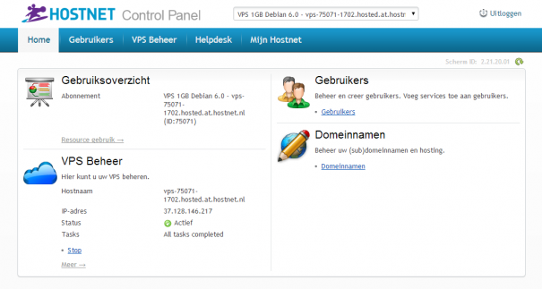 In het Hostnet Control Panel is te zien welke server is afgenomen. Verder is de hostname, ip-adres en status van de server zichtbaar. Ook is het mogelijk om de server vanaf deze pagina te starten en te stoppen. In het menu is er een optie “VPS Beheer”, op deze pagina staan dezelfde gegevens van de server nogmaals opgesomd en is er naast het starten en stoppen van de server ook de mogelijkheid om het OS van de server te updaten. Daarnaast is er ook een knop waarmee de hostname van de server zou kunnen worden veranderd. Deze knop is echter inactief en werkt derhalve niet.