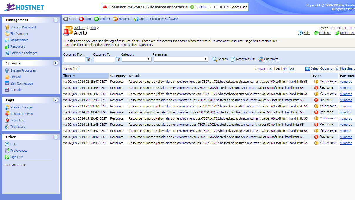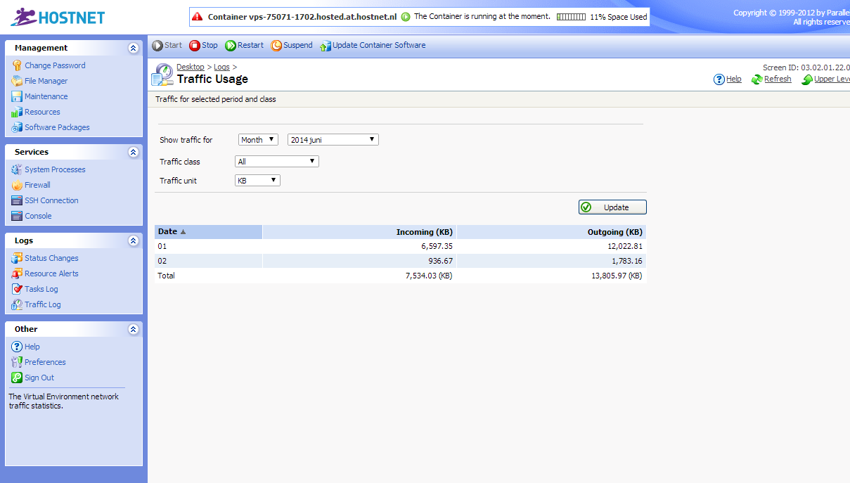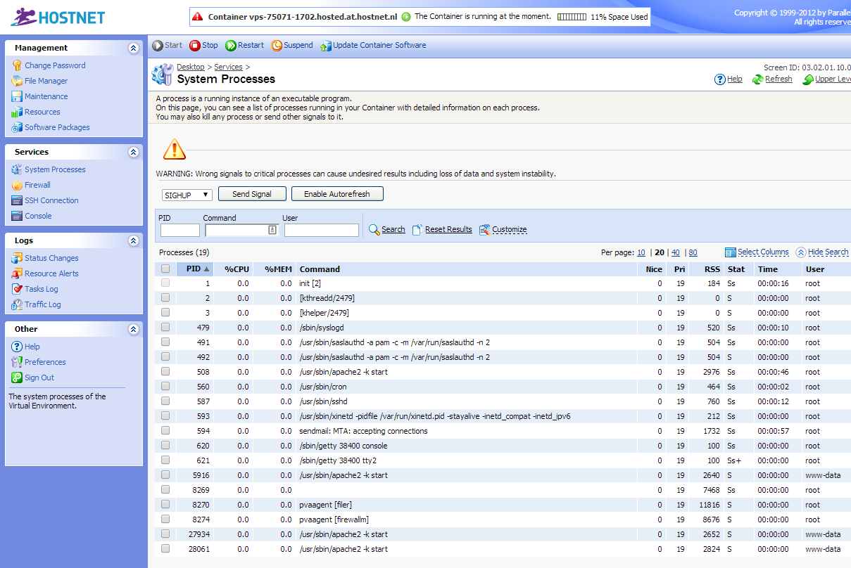 Verder valt de integratie tussen de virtuele server en het controle paneel op, waardoor een via het controle paneel veel controle over wat er op de server gebeurt kan worden uitgeoefend. Dat is een eigenschap die hoort bij het gebruik van Parallels software. De functionaliteit die er in zit werkt. Echter ontbreekt ook weer functionaliteiten die belangrijk of wenselijk zijn, zoals de mogelijkheid tot het maken van backups, historische statistieken en grafieken, geen mogelijkheid tot monitoring en het niet kunnen instellen van rDNS. Het controle paneel van Hostnet krijgt daarom een onvoldoende.