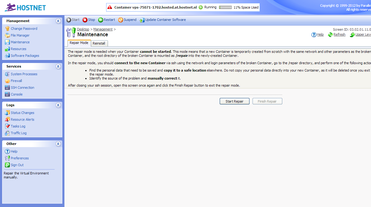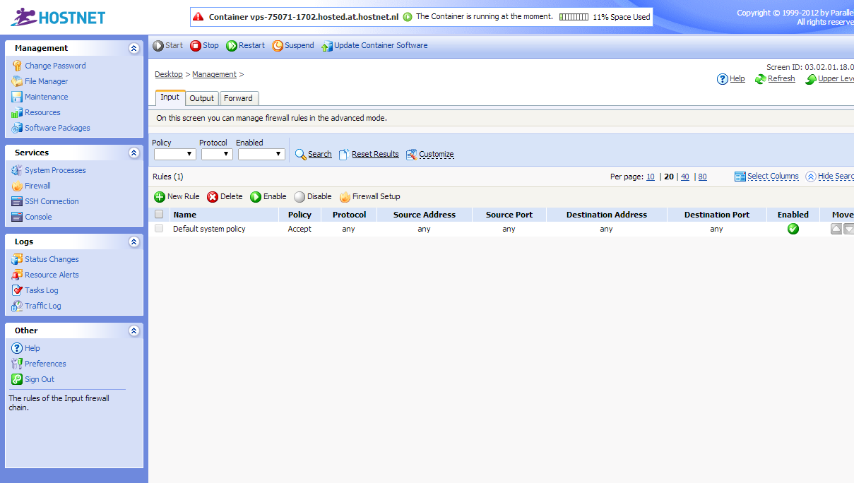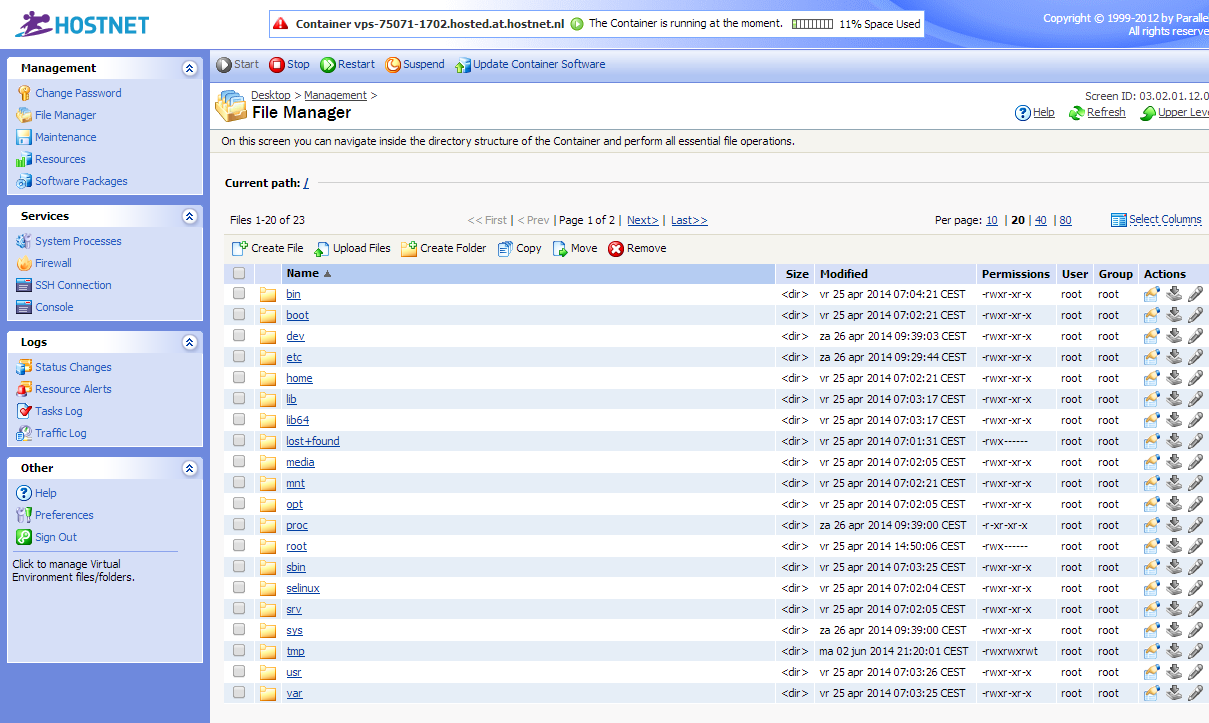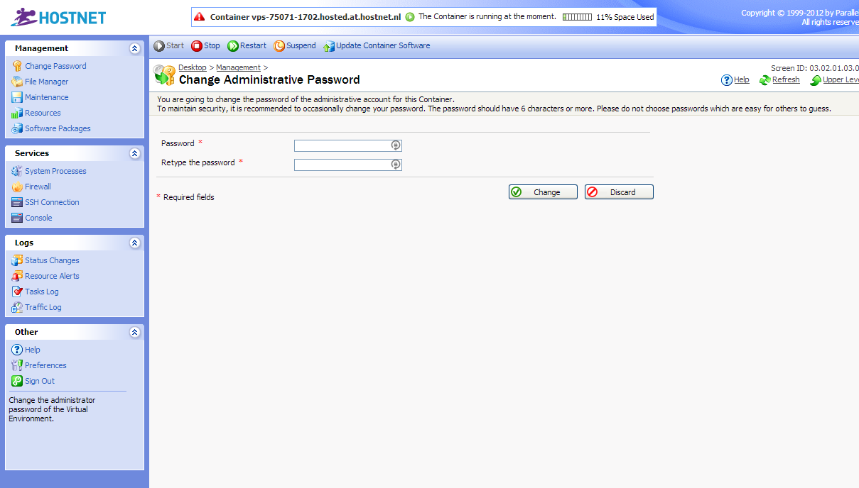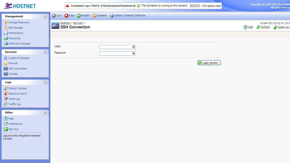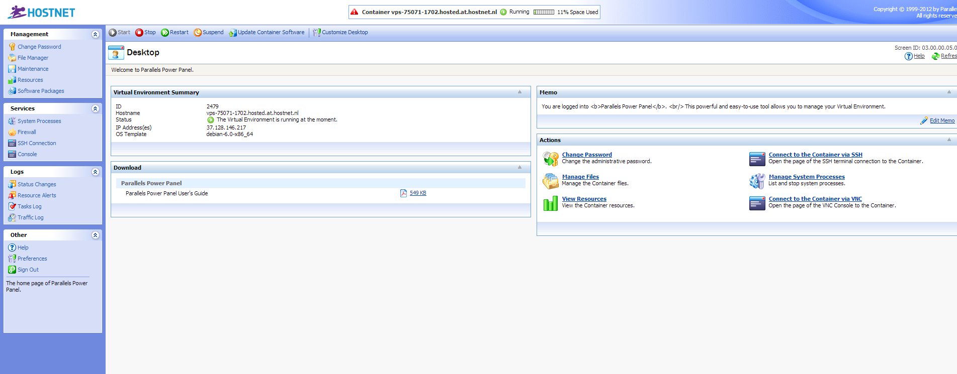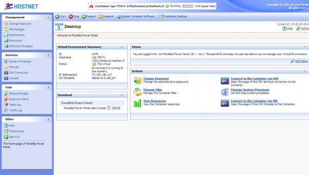 Voor het beheer van de virtuele server bij Hostnet moet je als klant eerst inloggen op Mijn Hostnet. Vandaar kan er worden doorgeklikt naar het Control Panel dat op Parallels draait waar enkele zaken geregeld kunnen worden, maar wie nog meer wil kunnen regelen moet nog een keer doorklikken naar het Power Panel. Ondanks dat dit soepel gaat, is dit toch enigszins omslachtig. Ook de waarschuwing door het self-signed certificaat van Power Panel is minder handig.