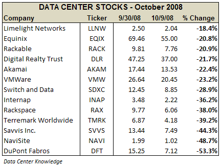 Banken en andere financiële instellingen hebben het de afgelopen weken zwaar te verduren gehad op de beurzen door de kredietcrisis. In de Verenigde Staten is op de Dow Jones op 10 oktober gedurende de laatste 7 beursdagen 21 procent van de totale beurswaarde verdampt. Echter hoe doen beursgenoteerde managed hosters en datacentra zoals Equinix, Rackspace en Savvis het in vergelijking met de index?