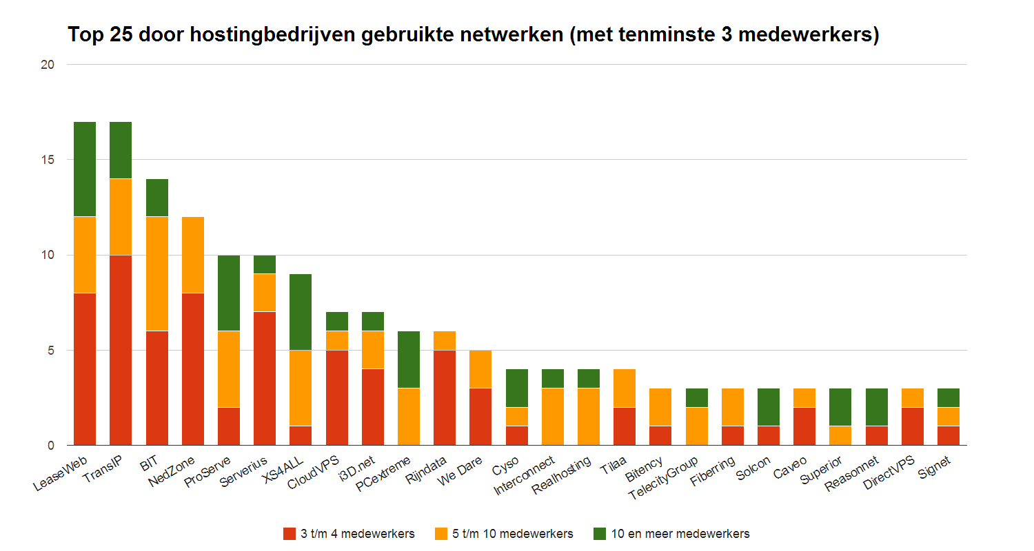 Wanneer echter wordt gekeken naar de netwerken met hostingbedrijven met tenminste 3 medewerkers dan verandert de top 25 drastisch. Op de eerste plaats staat nog steeds LeaseWeb, maar deze moet deze positie delen met TransIP, gezien beiden 17 hostingbedrijven huisvesten. Deze worden gevolgd door BIT (14 hostingbedrijven), NedZone (12 hostingbedrijven), ProServe en Serverius (beide 10 hostingbedrijven).
