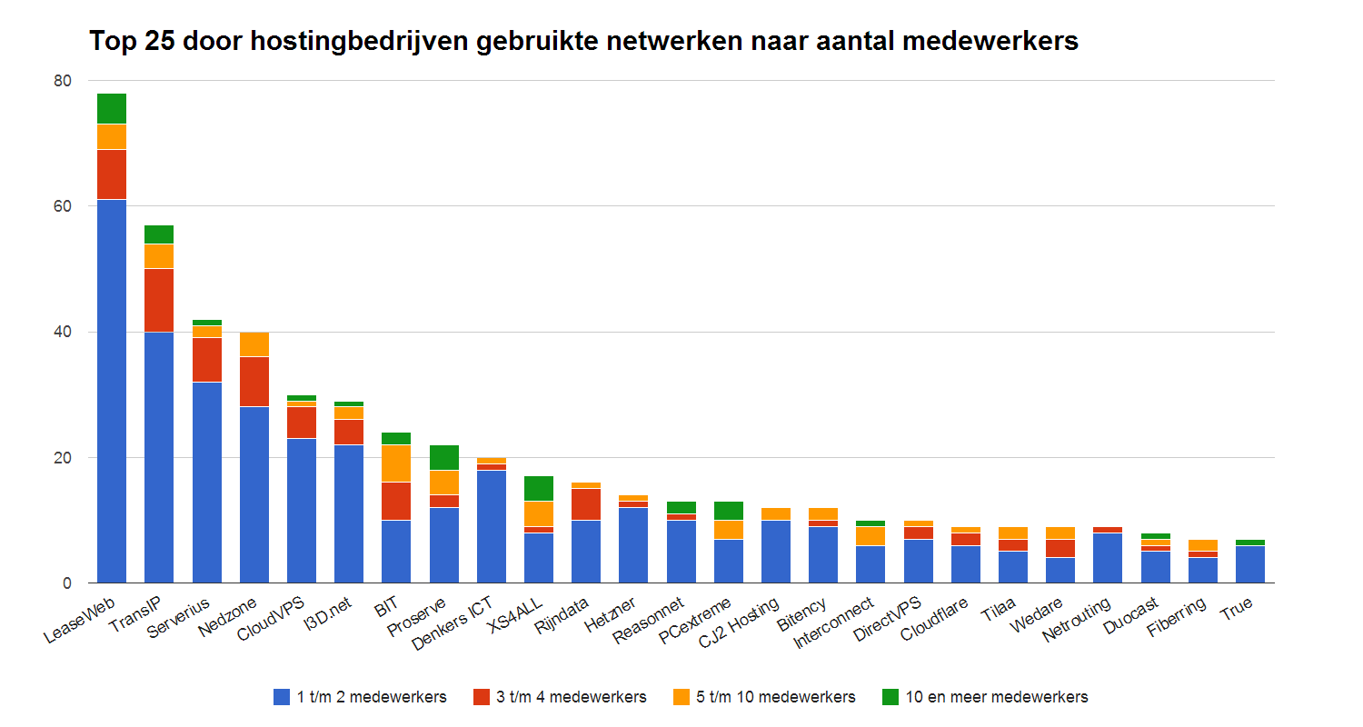 Vergeleken met de top 10 netwerken van hostingbedrijven, zijn er ook een aantal verschillen in aantallen in de lijst naar het aantal medewerkers omdat van een kwart van de hostingbedrijven het aantal medewerkers niet bekend is. In de top 25 van hostingnetwerken naar het aantal medewerkers is hier ook LeaseWeb de grootste, gevolgd door TransIP, Serverius, Nedzone en CloudVPS.