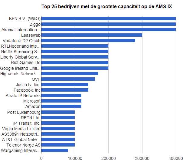 Het bedrijf met de grootste poortcapaciteit bij de AMS-IX is KPN (W&O). Het bedrijf heeft totaal 400.040 Mbps aan poortcapaciteit op de AMS-IX. Daarmee ligt het een haarlengte voor op Ziggo en Akamai die beide 400 Gbps aan poortcapaciteit hebben. De top 5 wordt gecomplementeerd door LeaseWeb met 300 Gbps en Vodafone D2 met 280 Gbps.