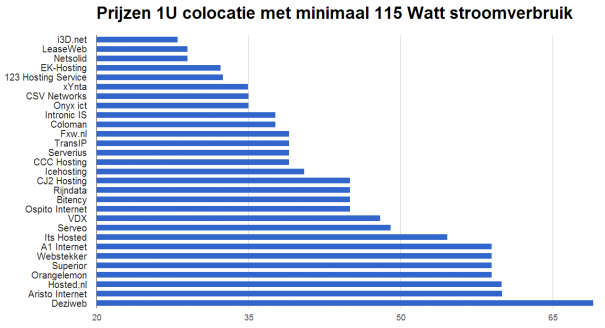 Voor de vergelijking ben ik uitgegaan van een aanbod van 1U (gedeelde) colocatie van Nederlandse hostingbedrijven, waarbij tenminste 115 Watt (of 0,5 Ampère) stroomverbruik is inbegrepen. De hoeveelheid dataverkeer of bandbreedte heb ik niet vergeleken.