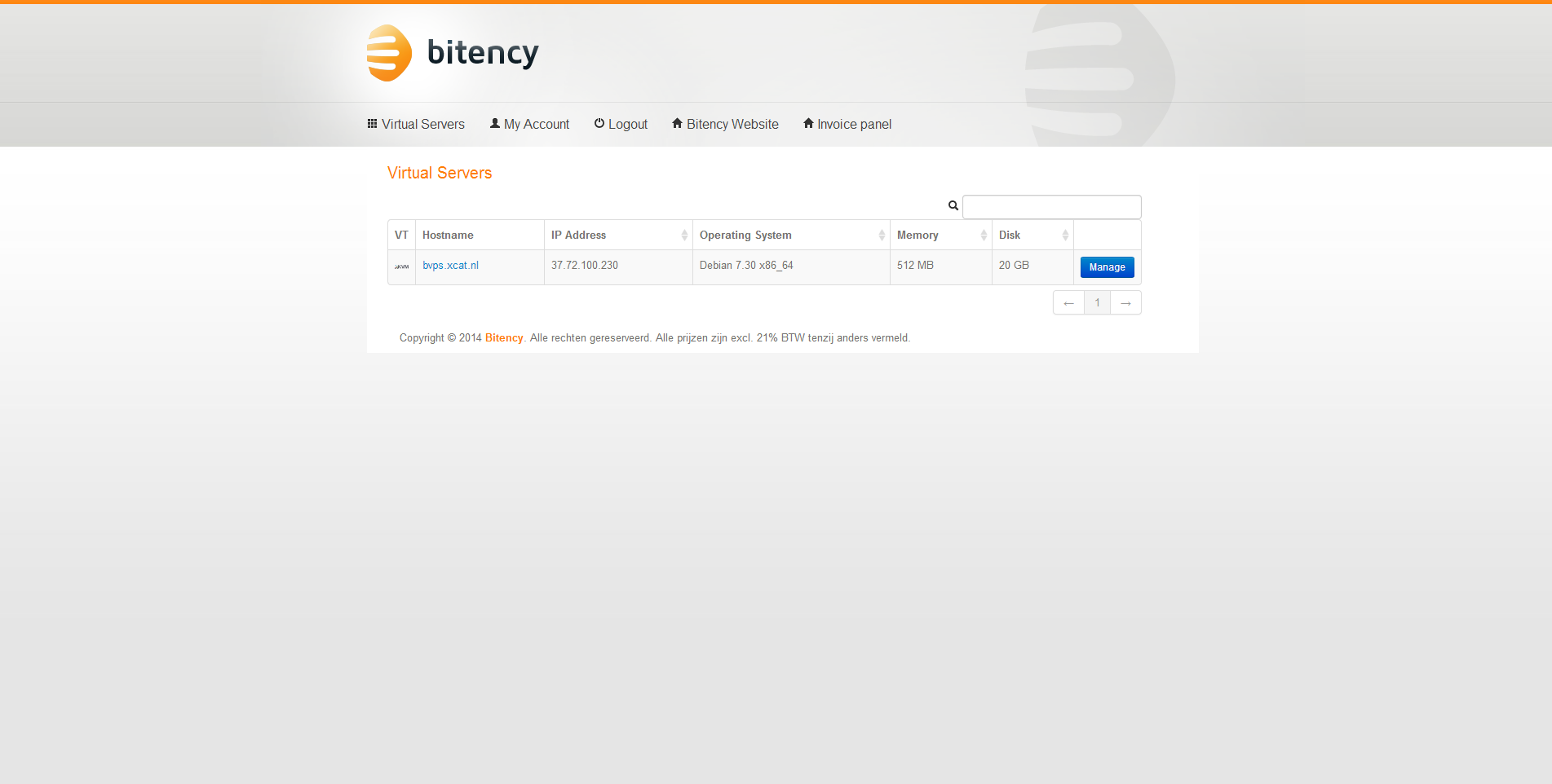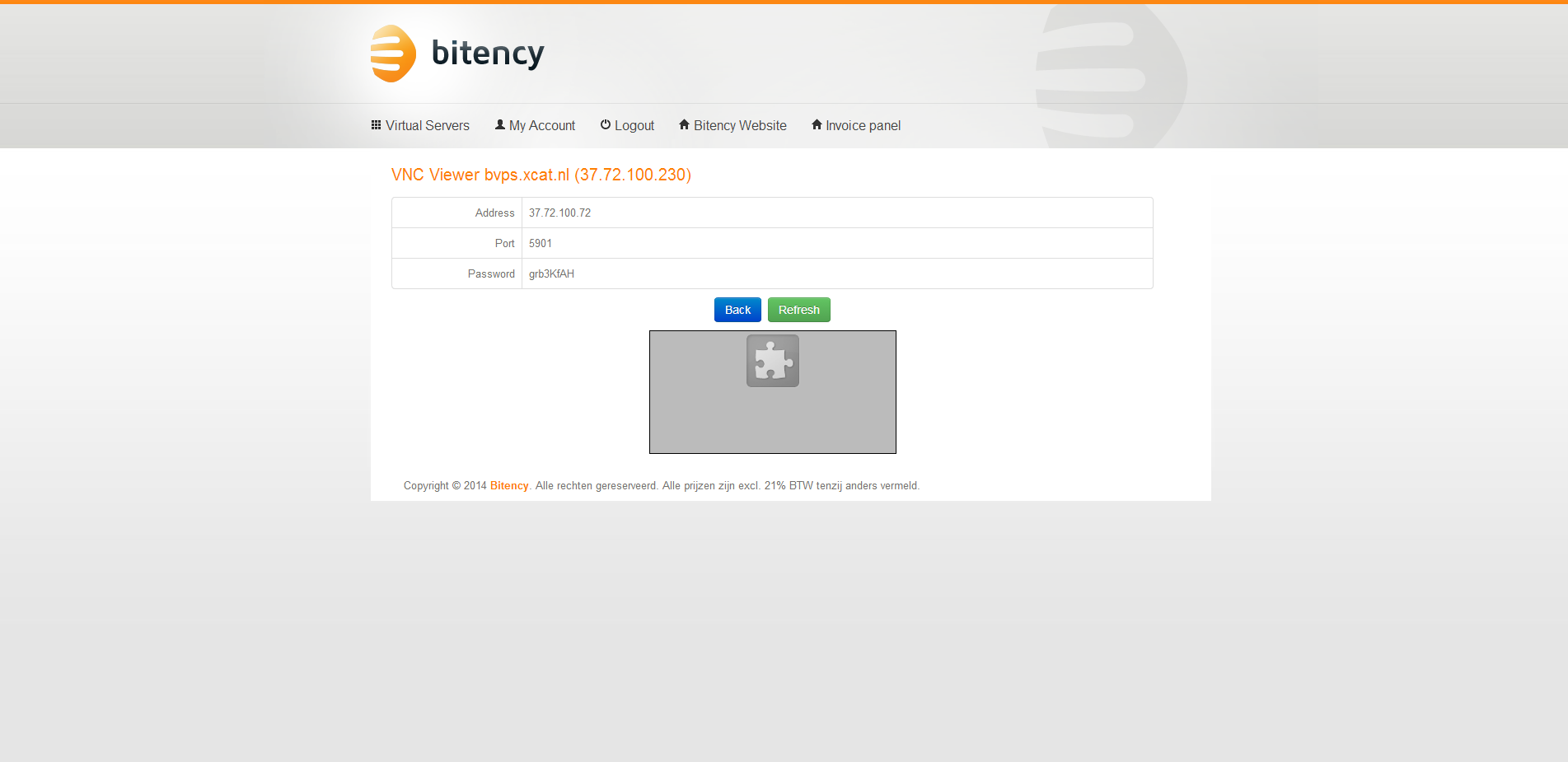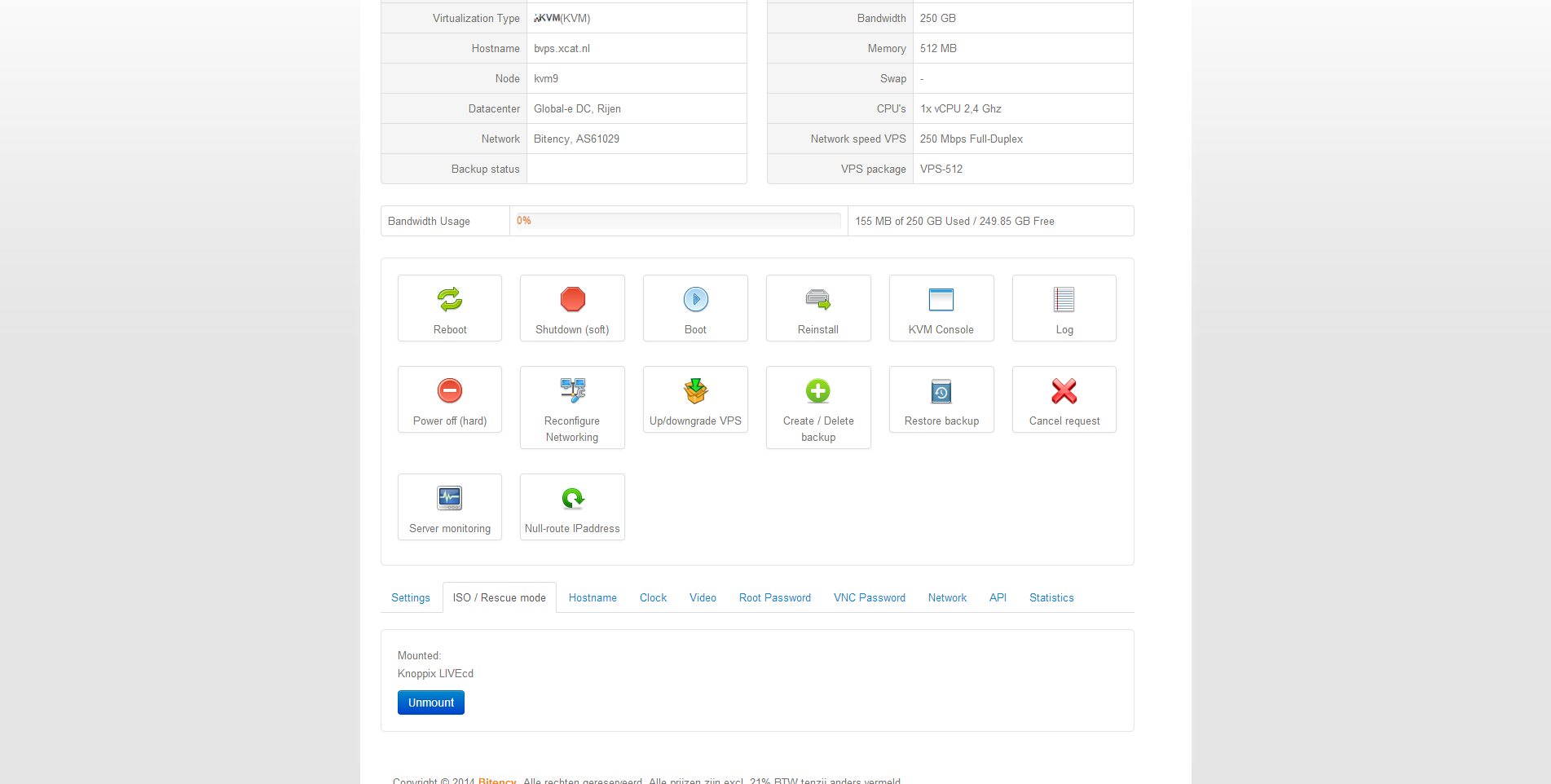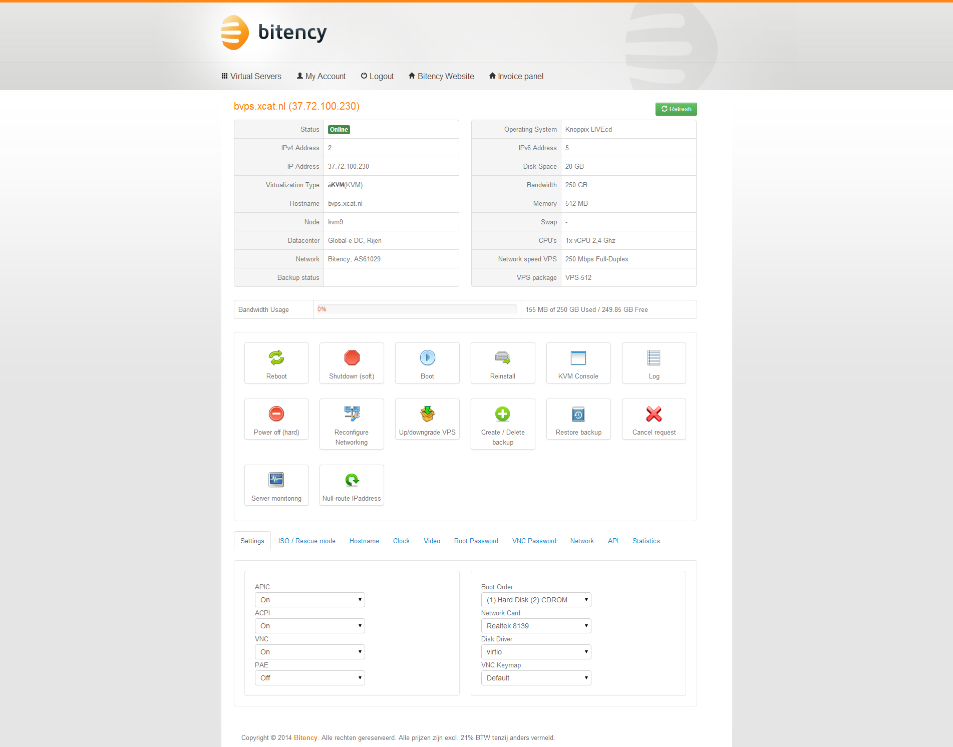 Na het plaatsen van de bestelling bij Bitency krijg ik een werkdag later een e-mail met daarin de logingegevens van het controle paneel van de virtuele server en het administratieve controle paneel. Bitency maakt gebruik van SolusVM voor het beheer van de virtuele servers en WeFact voor het administratieve beheer.
