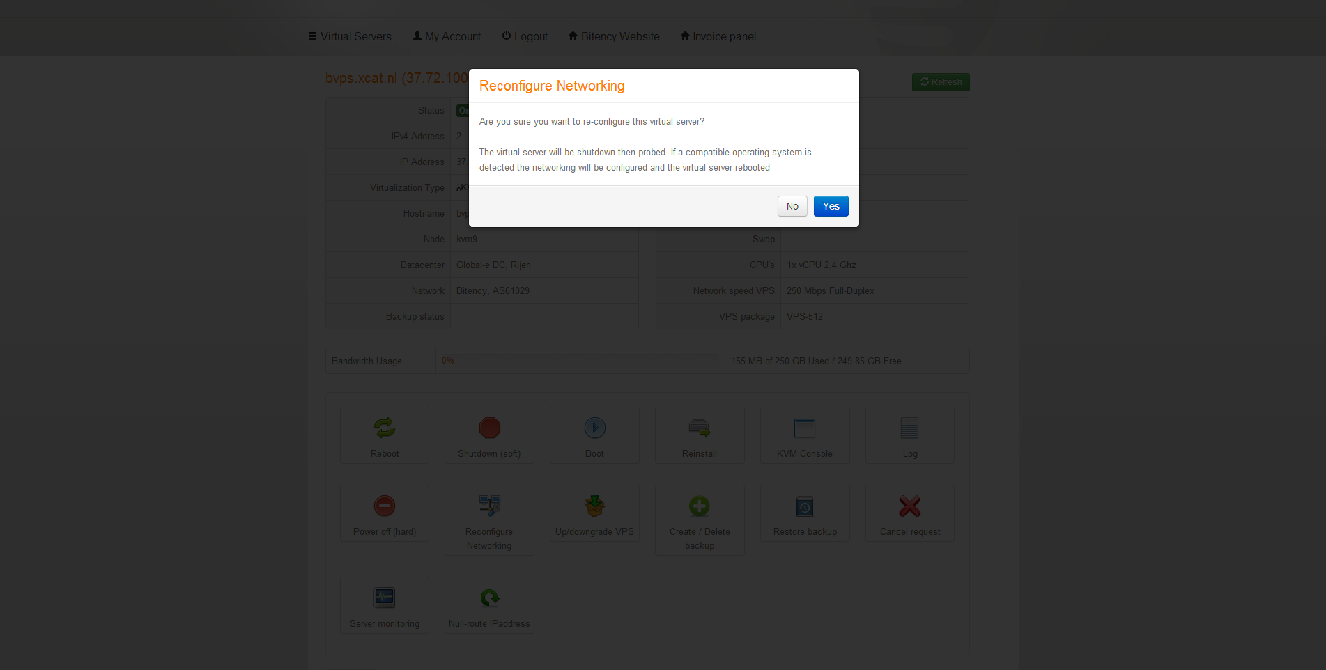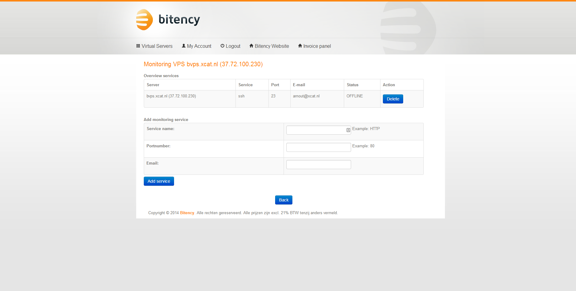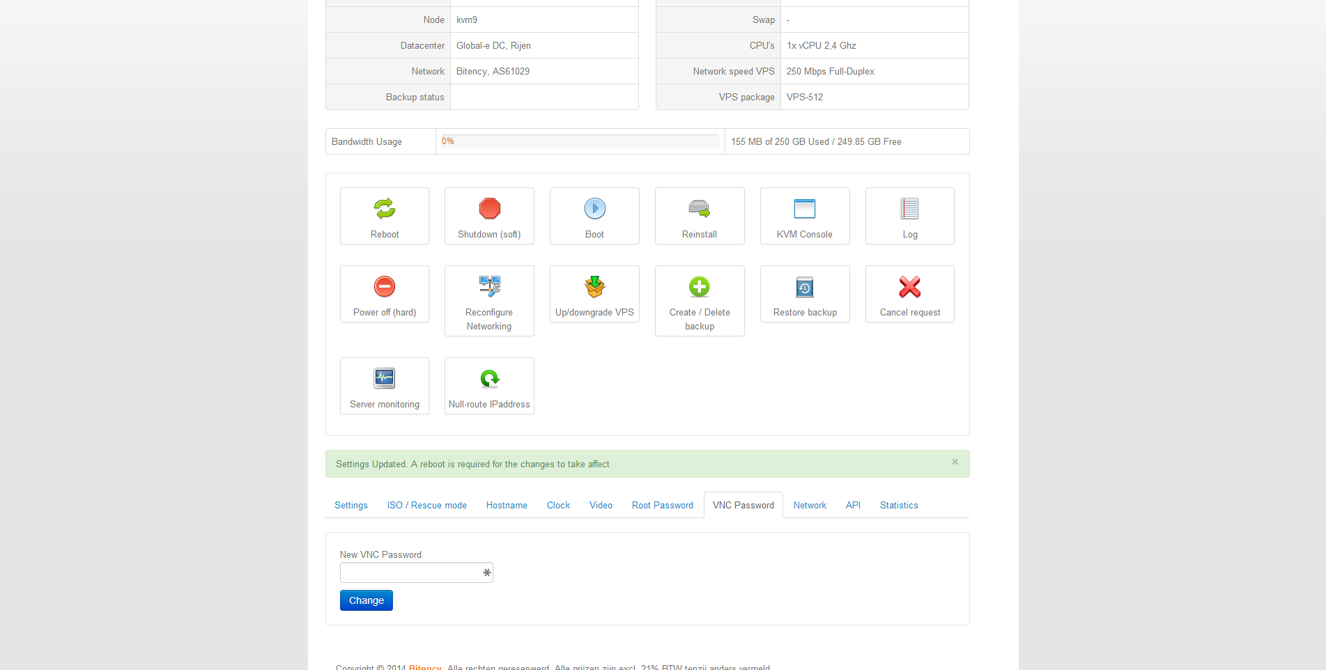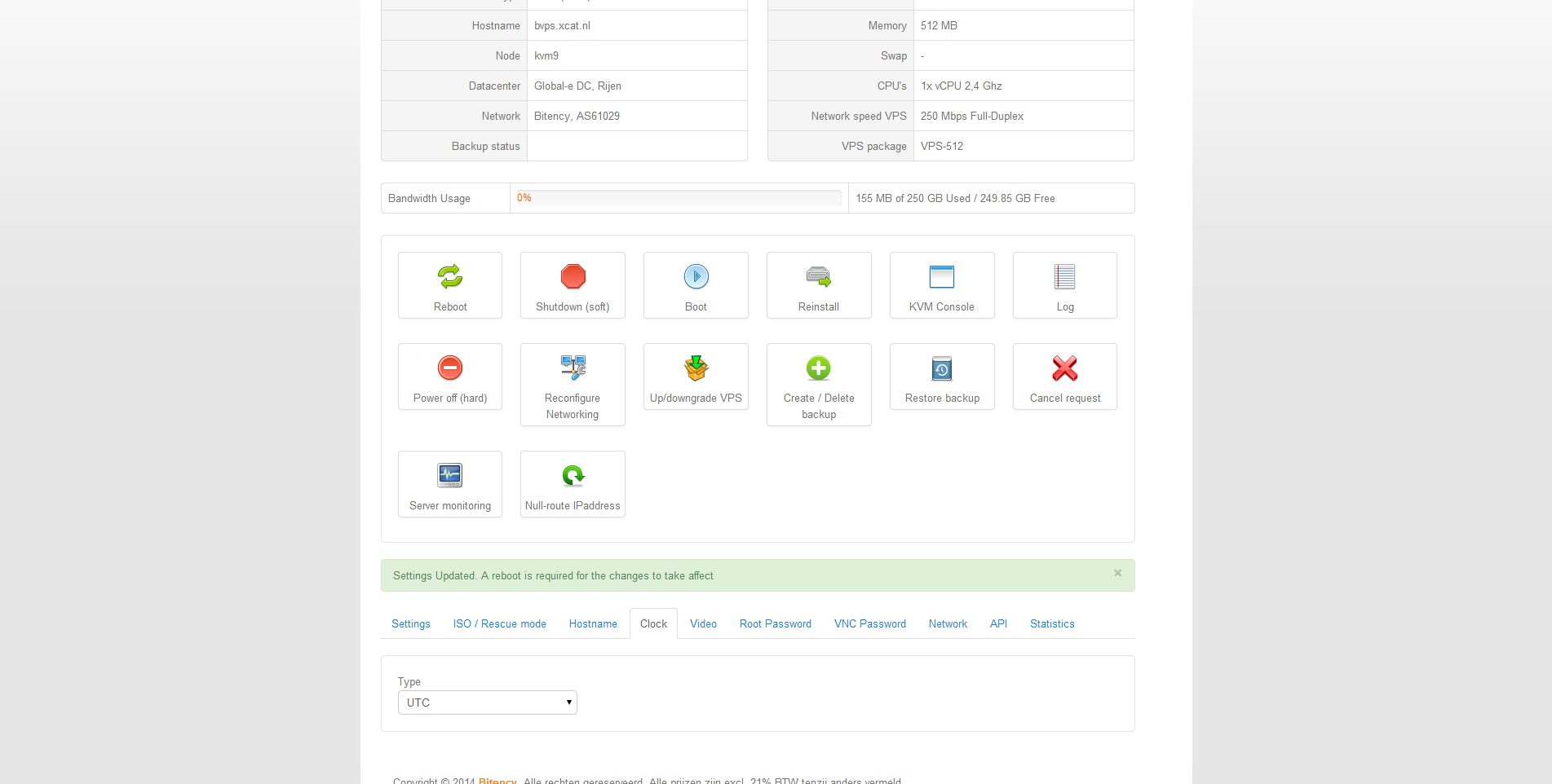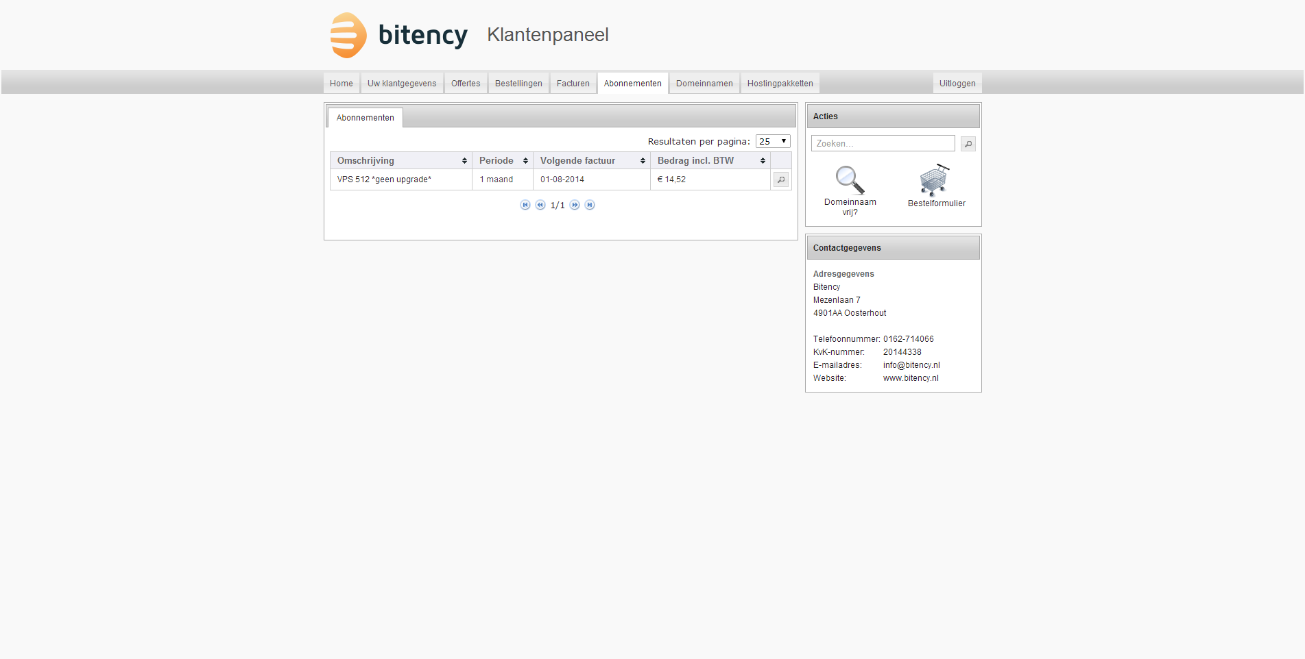 Na het plaatsen van de bestelling bij Bitency krijg ik een werkdag later een e-mail met daarin de logingegevens van het controle paneel van de virtuele server en het administratieve controle paneel. Bitency maakt gebruik van SolusVM voor het beheer van de virtuele servers en WeFact voor het administratieve beheer.