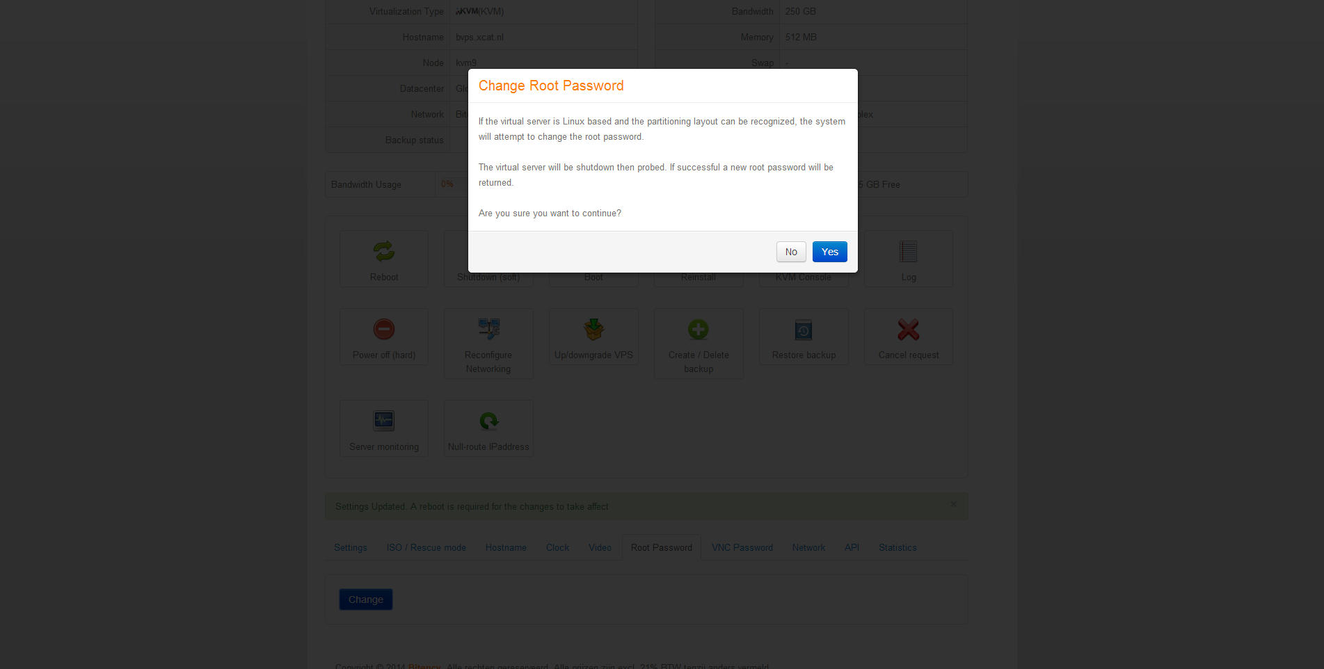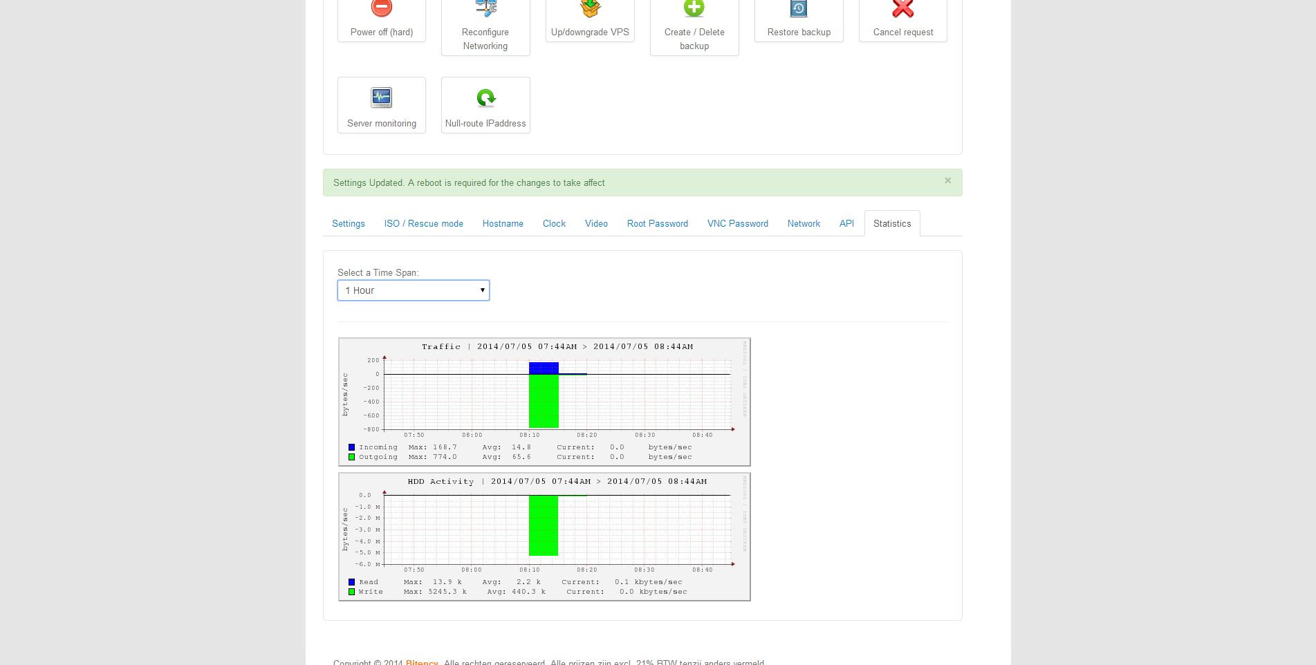 Verder staat onder het overzicht een indicator die aangeeft hoeveel dataverkeer in de huidige periode is gegenereerd. Daaronder staan knoppen waarmee elke mogelijke actie met de server kunnen worden uitgevoerd, van herstarten tot upgraden.