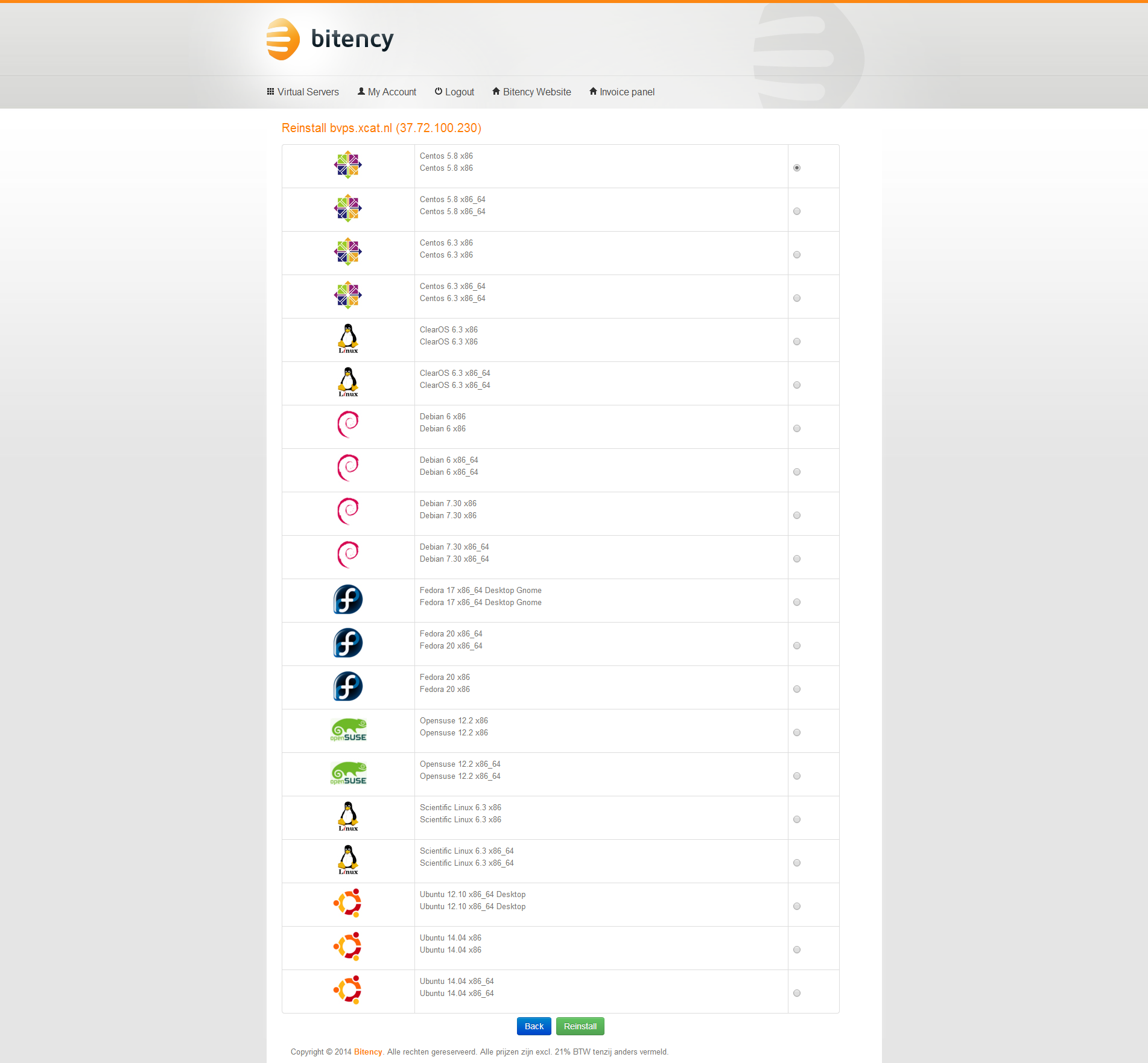 Het herinstalleren van de server met hetzelfde of een ander besturingssysteem gaat ook eenvoudig. Bij herinstallatie is er de keuze uit een aantal verschillende linux images. Herinstalleren van de server werkt prima.