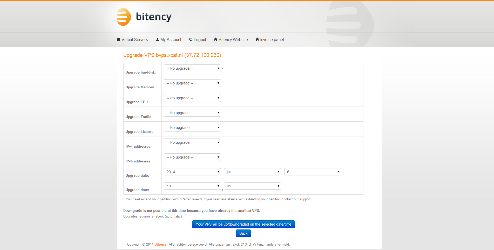 De mogelijkheid tot upgraden én downgraden van de server zijn uitstekend. Ik heb het niet getest, maar hardeschijf, geheugen en cpu-cores kunnen eenvoudig worden toegevoegd. Net als extra dataverkeer, IPv4- en IPv6-adressen en een licentie op een control panel zoals DirectAdmin of cPanel. Daarbij is er zelfs de keuze om aan te geven op welke datum én tijdstip de upgrade moet ingaan.