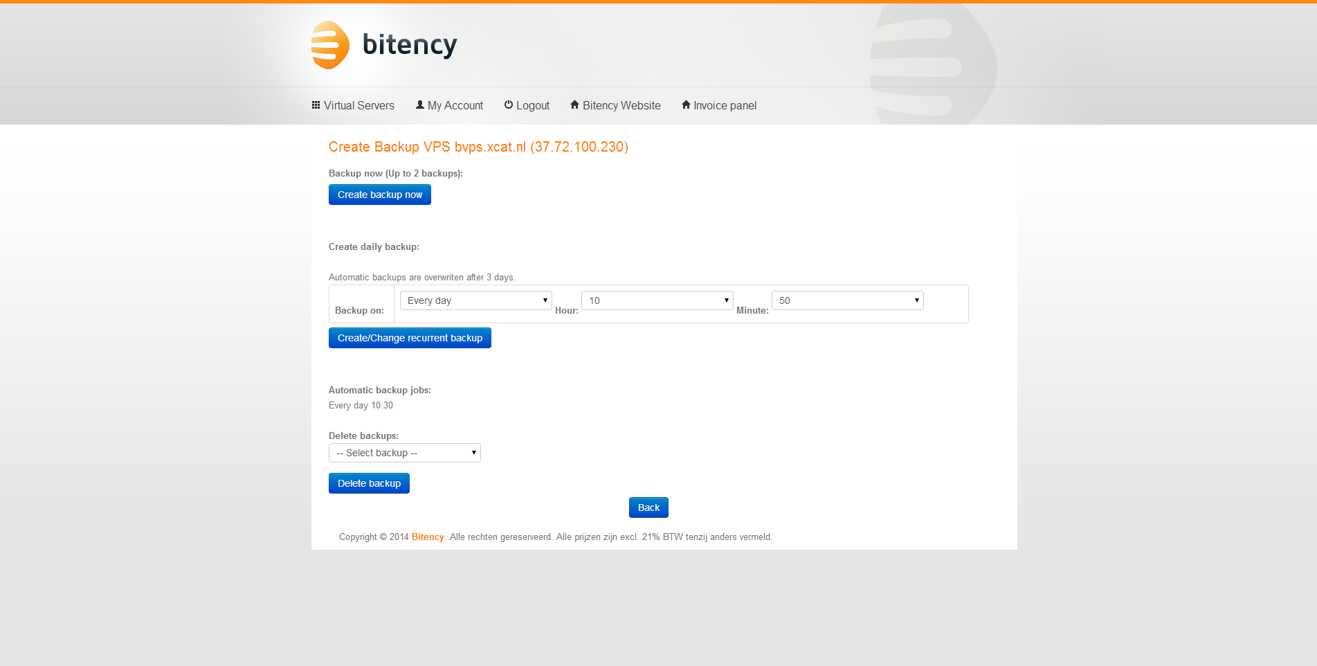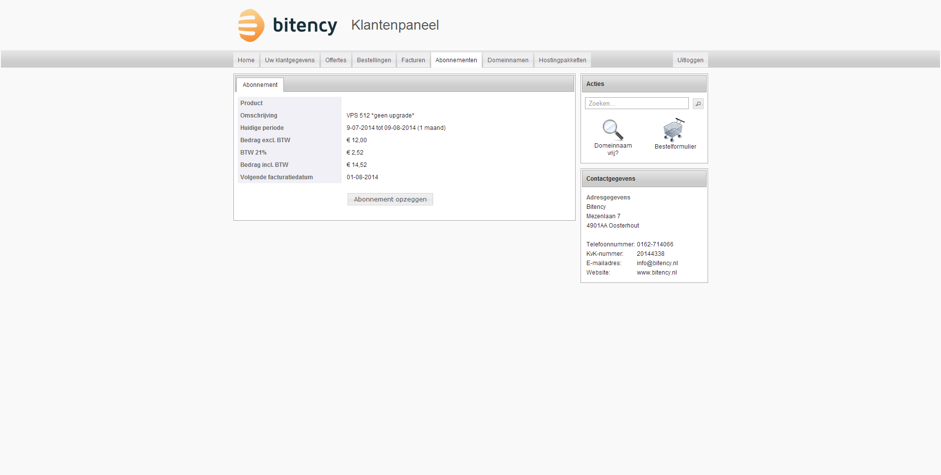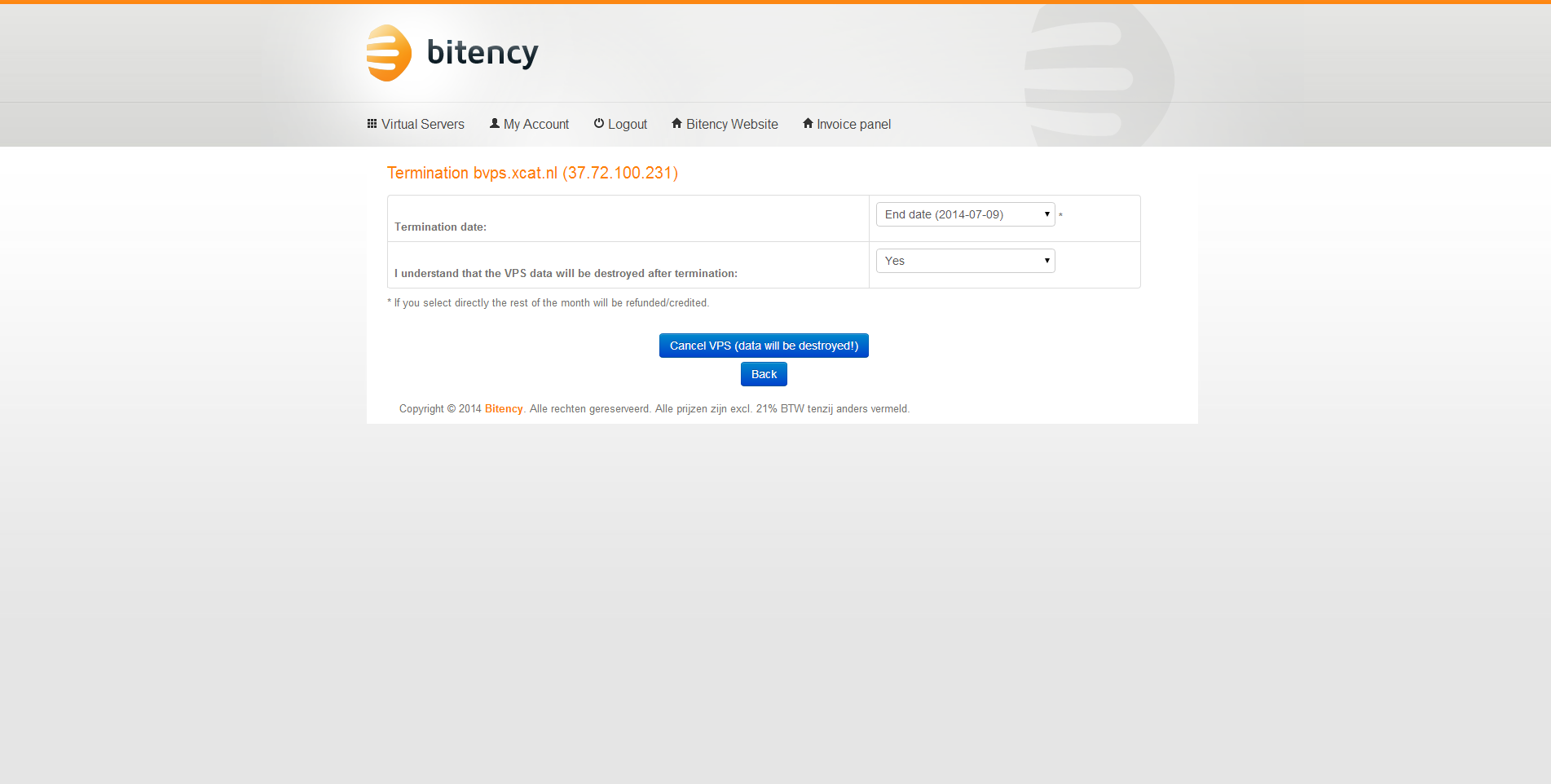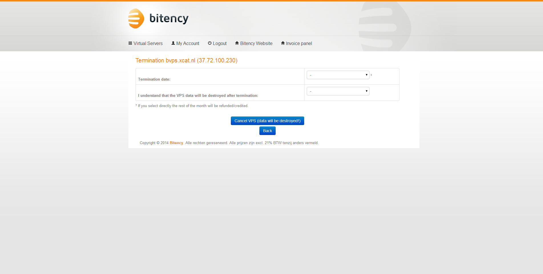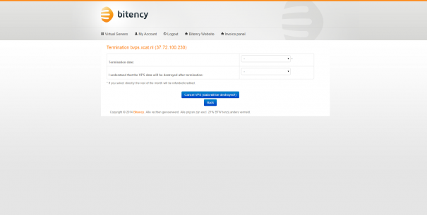 Ik heb er voor gekozen om op te zeggen via het server controle paneel. Dat gaf geen problemen. Na de opzegging kreeg ik zelfs een credit factuur voor de ongebruikte dagen. De server is dus feitelijk per dag op te zeggen. Een positieve verassing, dat nog iets duidelijker communiceren zou marketingtechnisch handig zijn voor Bitency. Na de opzegging was het via het controle paneel mogelijk om deze weer te annuleren. Uitstekend!