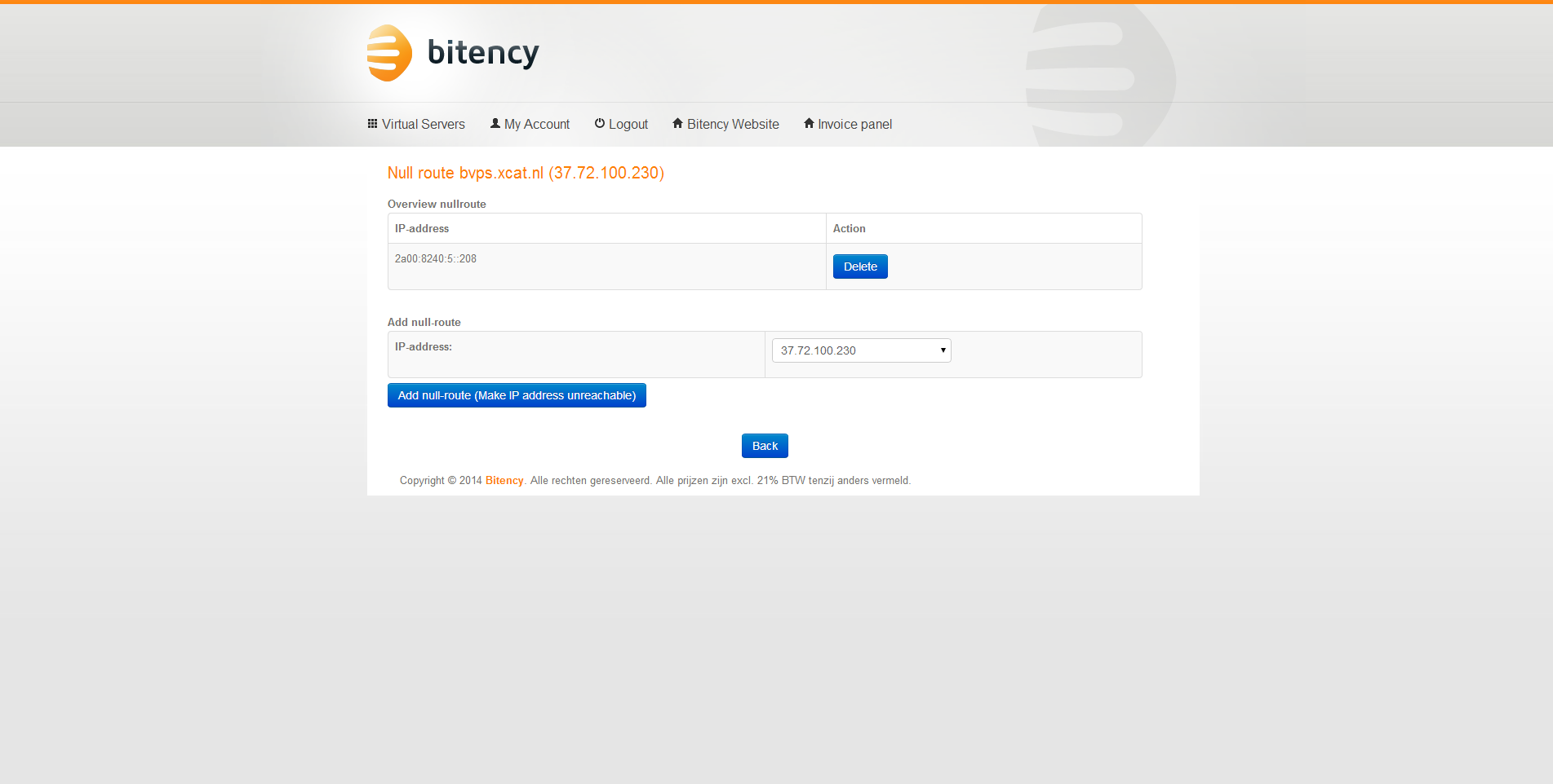 Een mogelijkheid die het controle paneel wél biedt voor zowel de IPv4- als IPv6-adressen is om deze individueel te null-routen. Na het selecteren van het te nul-routen IP-adres is dit met één klik geregeld en daarna duurt het enkele minuten volgens het controle paneel voor dat de null-routing effect heeft.