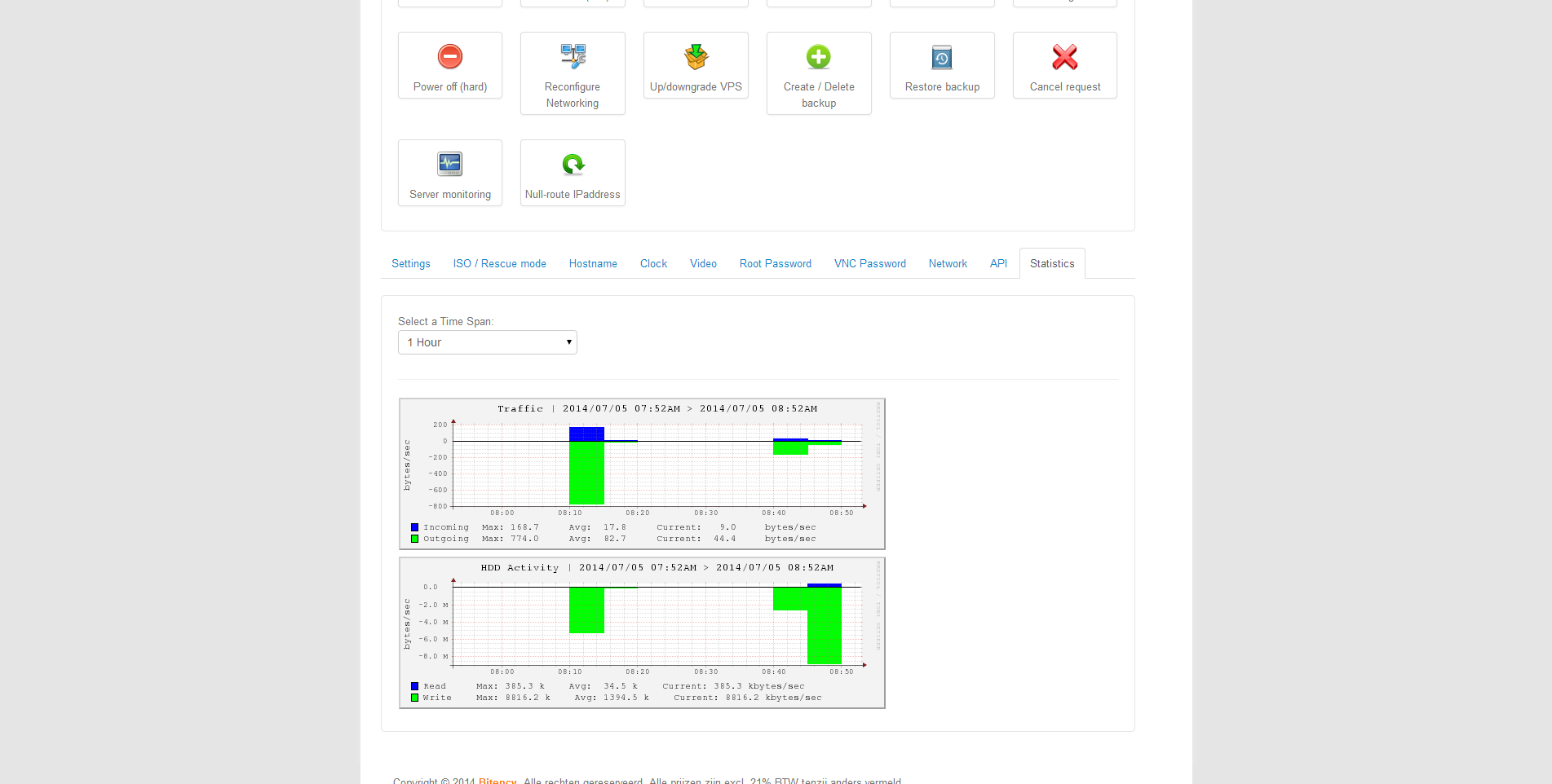 De statistieken in het controle paneel zijn zeer beperkt. Via een tabblad onderaan de centrale pagina is er een tab ‘Statistics’. Daar valt enkel de lees- en schrijfacties van de hardeschijf te zien en de hoeveelheid inkomend en uitgaand dataverkeer van de server. Wel is er de mogelijkheid om te selecteren over een hoe lange historische periode dit moet worden weergegeven, waarbij in stappen kan worden gekozen van één uur tot één jaar terug.