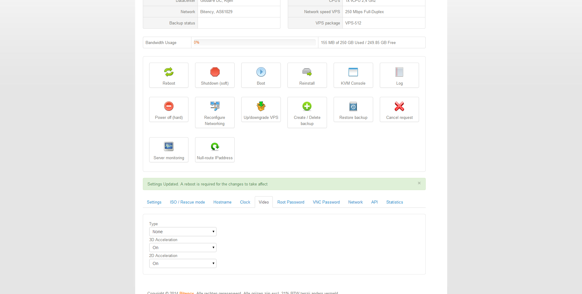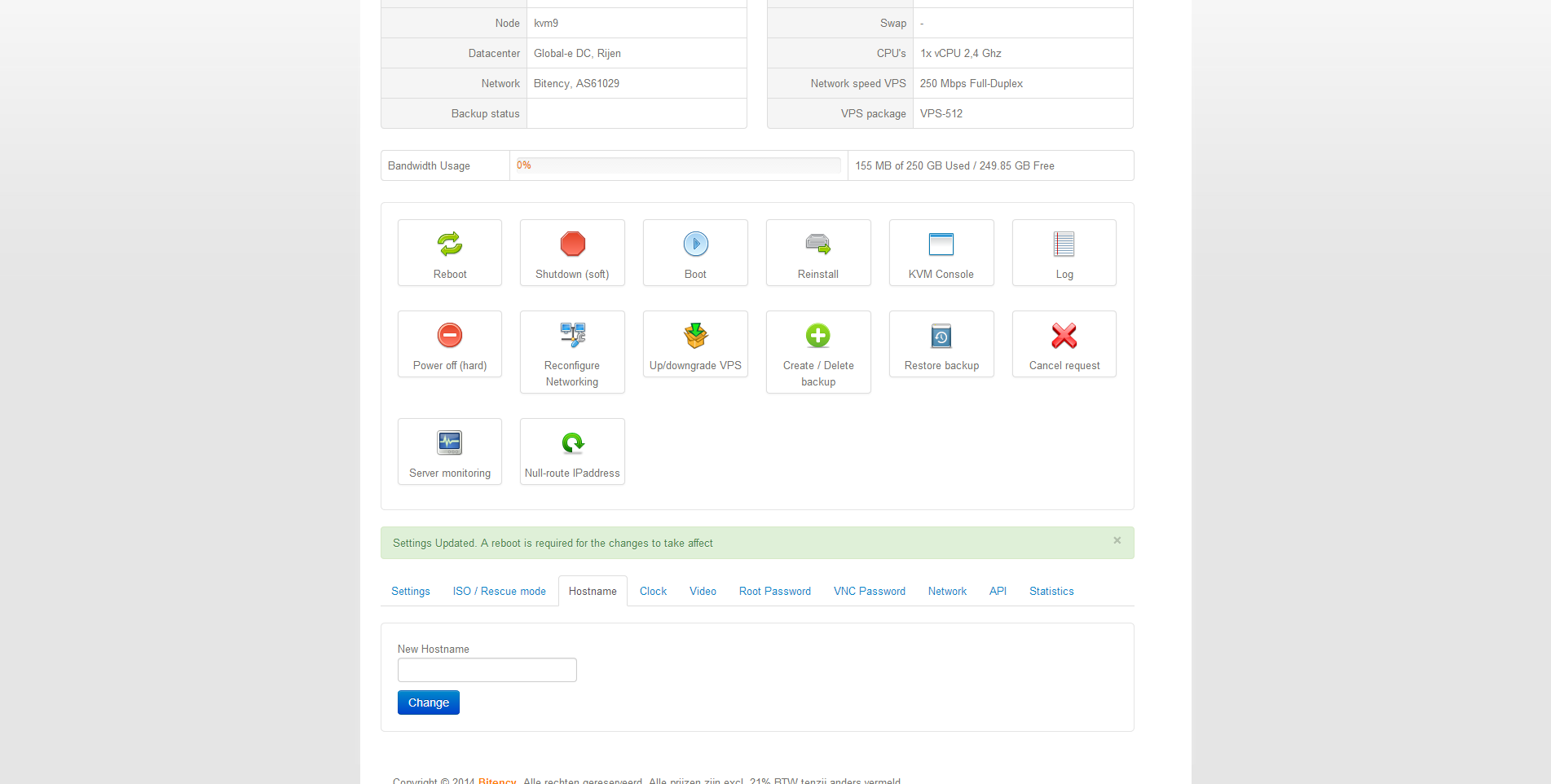 De belangrijkste acties, zoals een reboot of herinstallatie, maar ook het mounten van een virtuele rescue cd bij de server wordt bijgehouden in een logboek binnen het controle paneel.