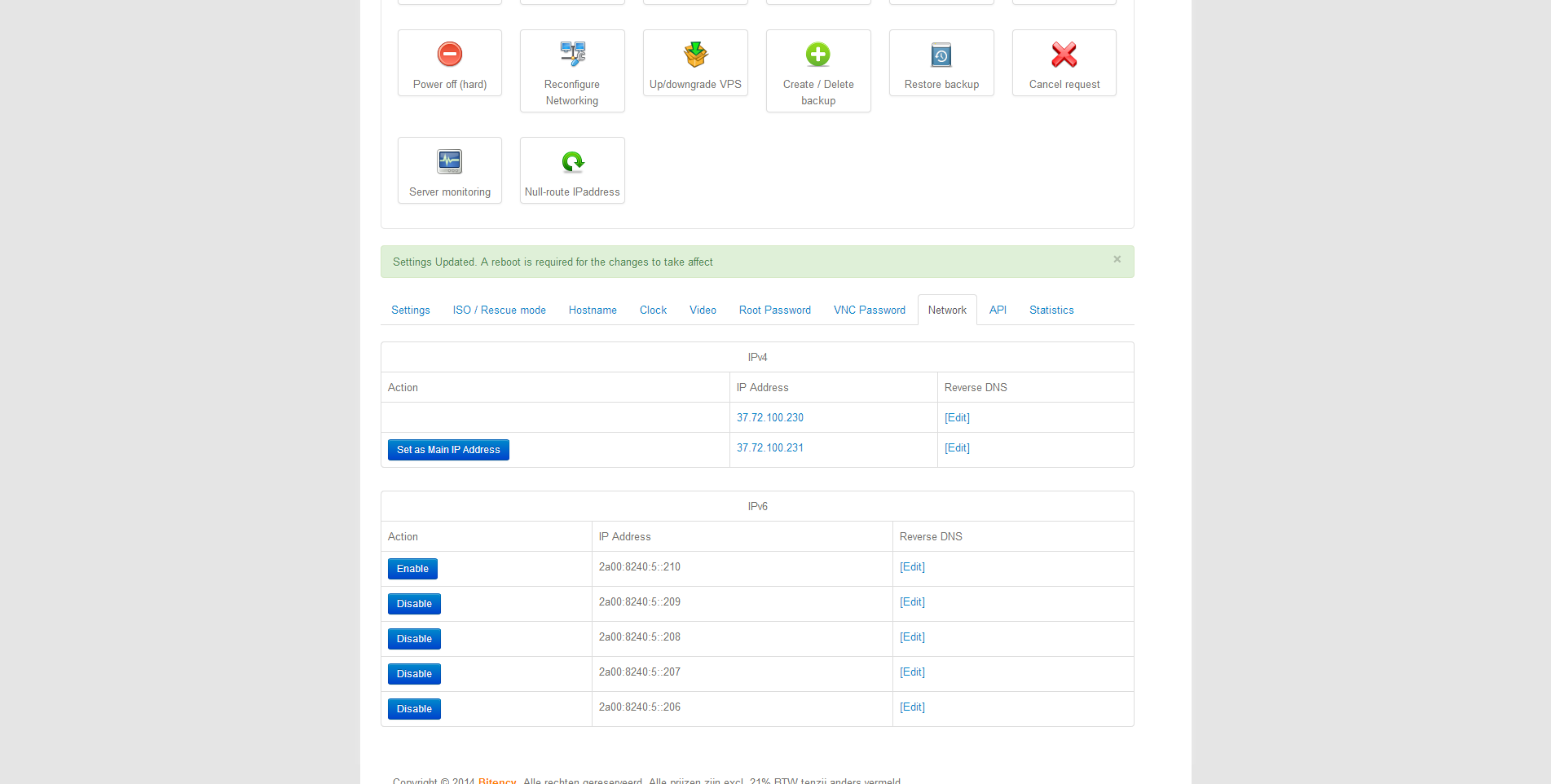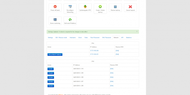 Bij de server zitten 2 IPv4-adressen en 5 IPv6-adressen inbegrepen. Onderaan de pagina bij de instellingen kan ik voor elk van de IP-adressen de reverse DNS instellen. Daarbij wordt gecontroleerd of de opgegeven hostname respectievelijk een A- of AAAA-record heeft dat er naar het bewuste IP-adres verwijst. Zo niet, dan weigert het systeem het record aan te maken.