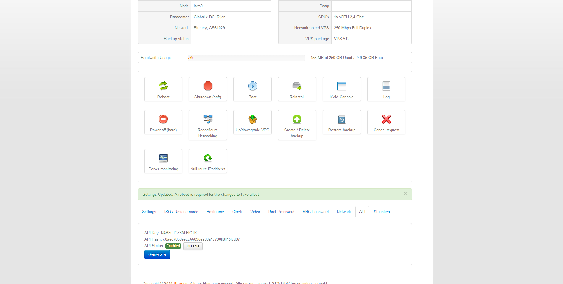 Een laatste manier om de server te beheren is via een API. Hiervoor kan bij instellingen een key worden aangemaakt. Helaas is er geen documentatie van de API te vinden en nu er ook niet is vermeld dat er gebruik van SolusVM zal een gebruiker eerst moeten zoeken of contact met Bitency moeten opnemen om de specificaties te achterhalen.