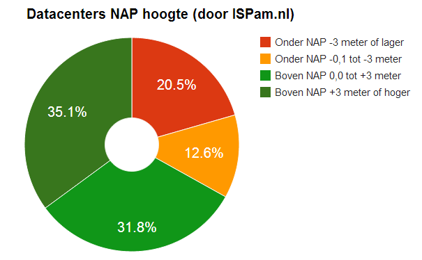 Uit onderzoek van ISPam.nl blijkt dat 50 van de 156 vergeleken datacenters onder NAP oftewel het gemiddelde zeeniveau zijn gelegen. Daarnaast zijn er 51 datacenters die óp of op maximaal 3 meter boven NAP zijn gelegen. In het geval van een hevige overstroming zijn ook deze datacenters niet persé veilig, tenzij het datacenter op een verhoging is gebouwd.
