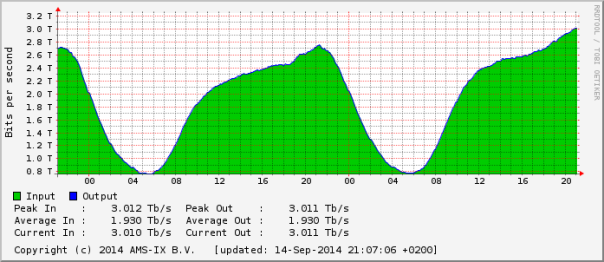 Zojuist is er voor het eerst via de AMS-IX in Amsterdam meer dan 3 Tbps aan dataverkeer uitgewisseld. Daarmee verbreekt de internet exchange het record van 2,5 Tbps dataverkeer dat een klein jaar geleden werd gehaald.